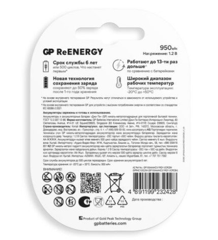 Ак-р GP 100AAAHC3/1RGY-2CRCB4 емкость 1000 мАч - 4 шт. (4891199232428) отличаются долгим сроком службы, стабильной работой в широком температурном диапазоне и способны выдерживать до 500 циклов зарядки.