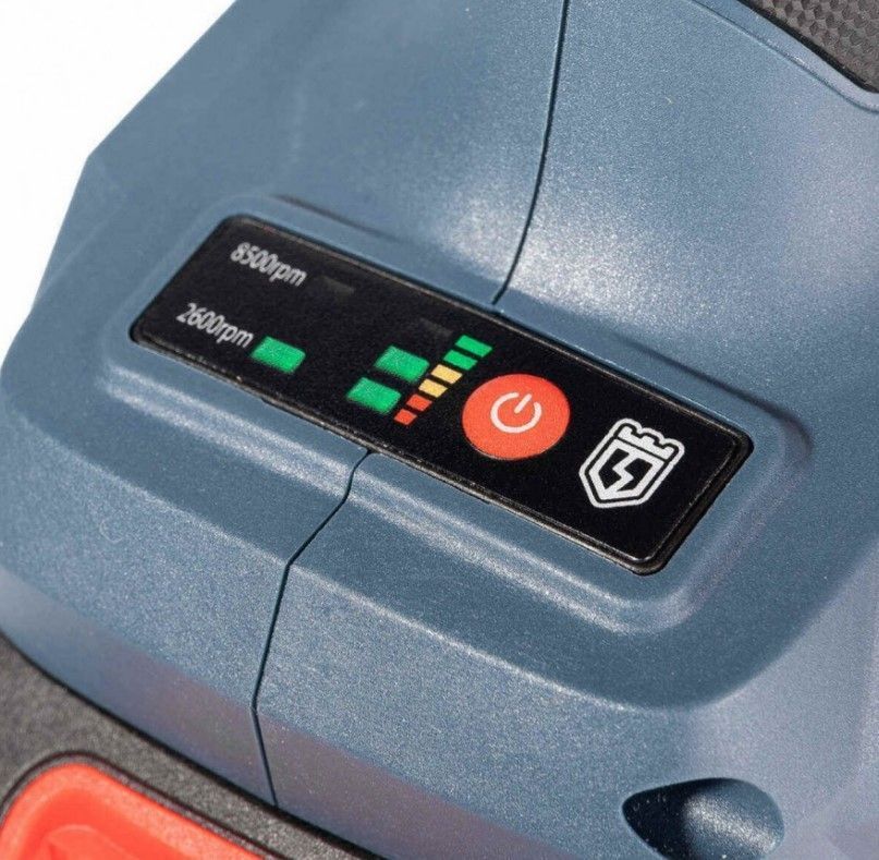Светодиод-индикатор заряда батареи. Защита от замыкания/перегрева/перенапряжения аккумуляторной батареи. Защита от пониженного напряжения аккумуляторной батареи. Кнопка блокировки шпинделя для установки и замены оснастки. Защитный кожух. Дополнительная боковая рукоятка.