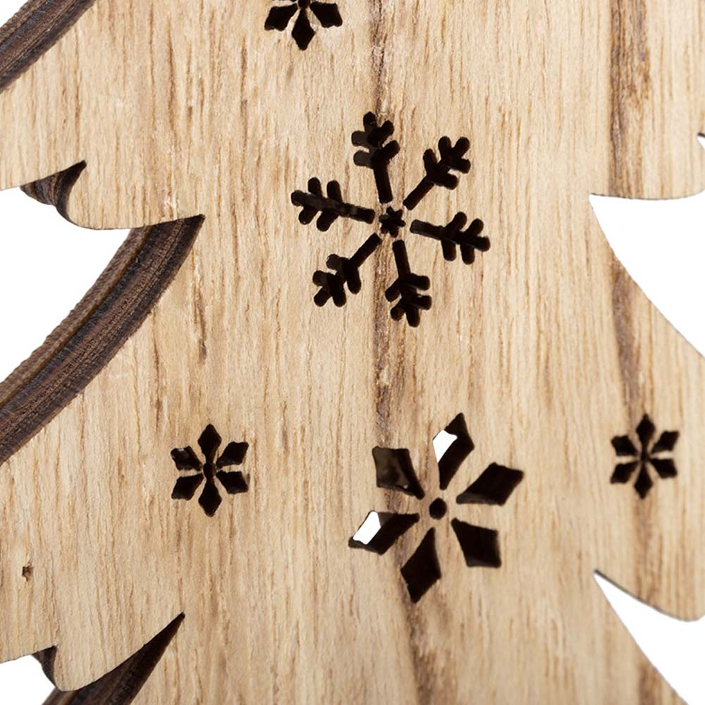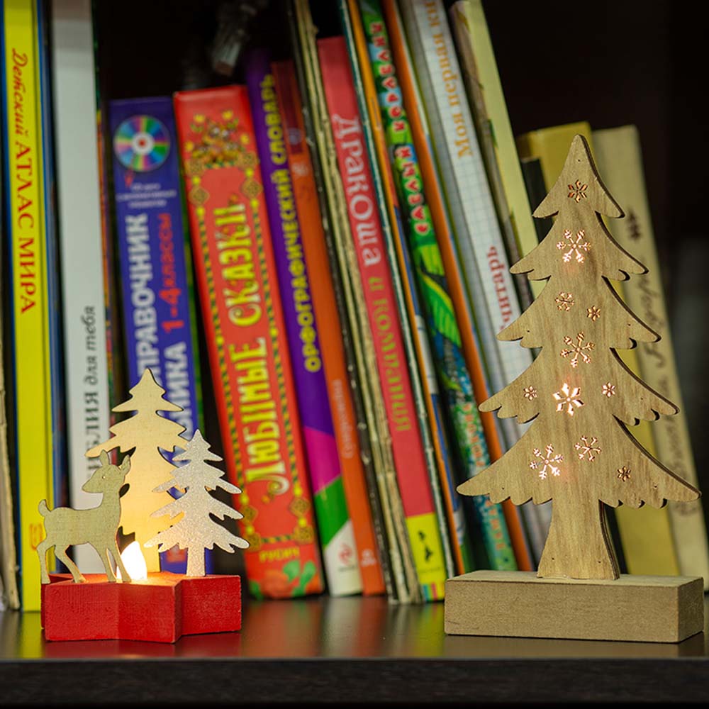 Деревянная фигурка с подсветкой «Елочка» 9×5×19 см — экологичное, безопасное и очень эффектное интерьерное украшение, которое понравится и взрослым, и детям. Декоративный элемент выполнен в виде елки из листовой древесины с характерной фактурой. На поверхности вырезаны сквозные снежинки разных форм, через которые проникает мягкий теплый свет трех диодов, расположенных внутри. Светодиоды, питающиеся от батареек типа ААА (батарейки не в комплекте), не нагревают изделие и экономно расходуют заряд. Деревянная фигурка с подсветкой станет прекрасным подарком к любому зимнему празднику.