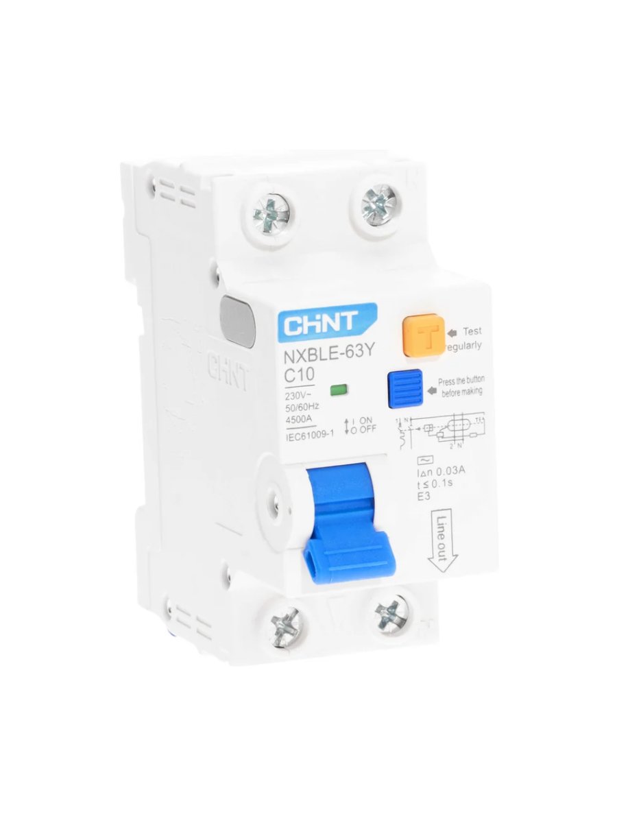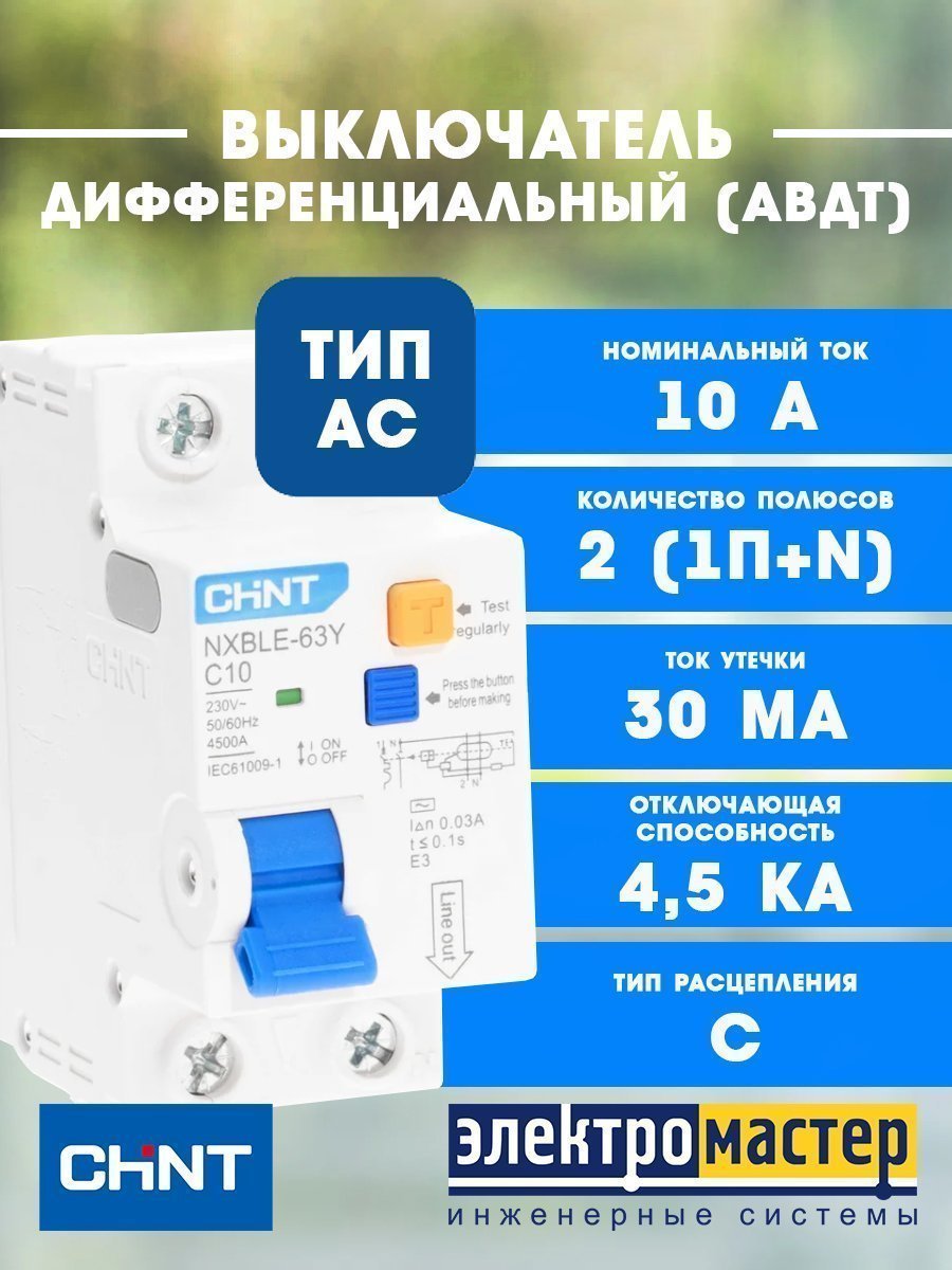 Дифференциальный автоматический выключатель 1п+N С10 30мА 4.5кА электрон. тип AC CHINT (NXBLE-63Y (R))