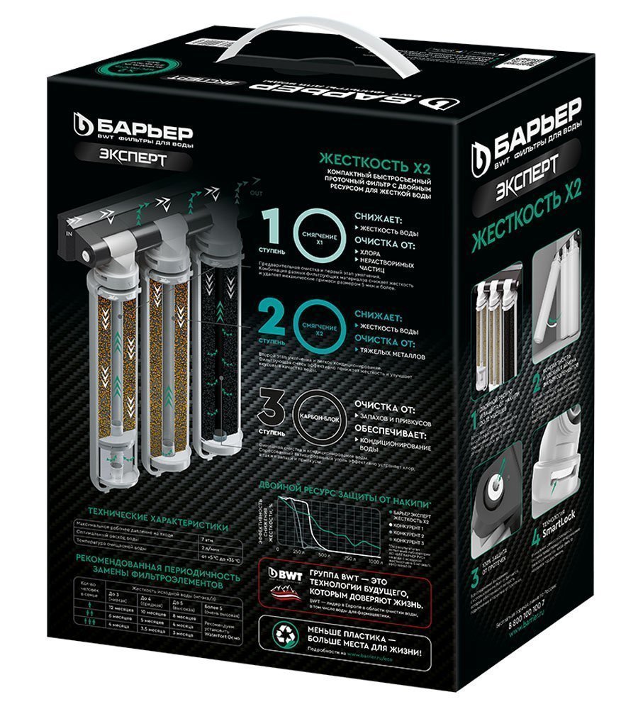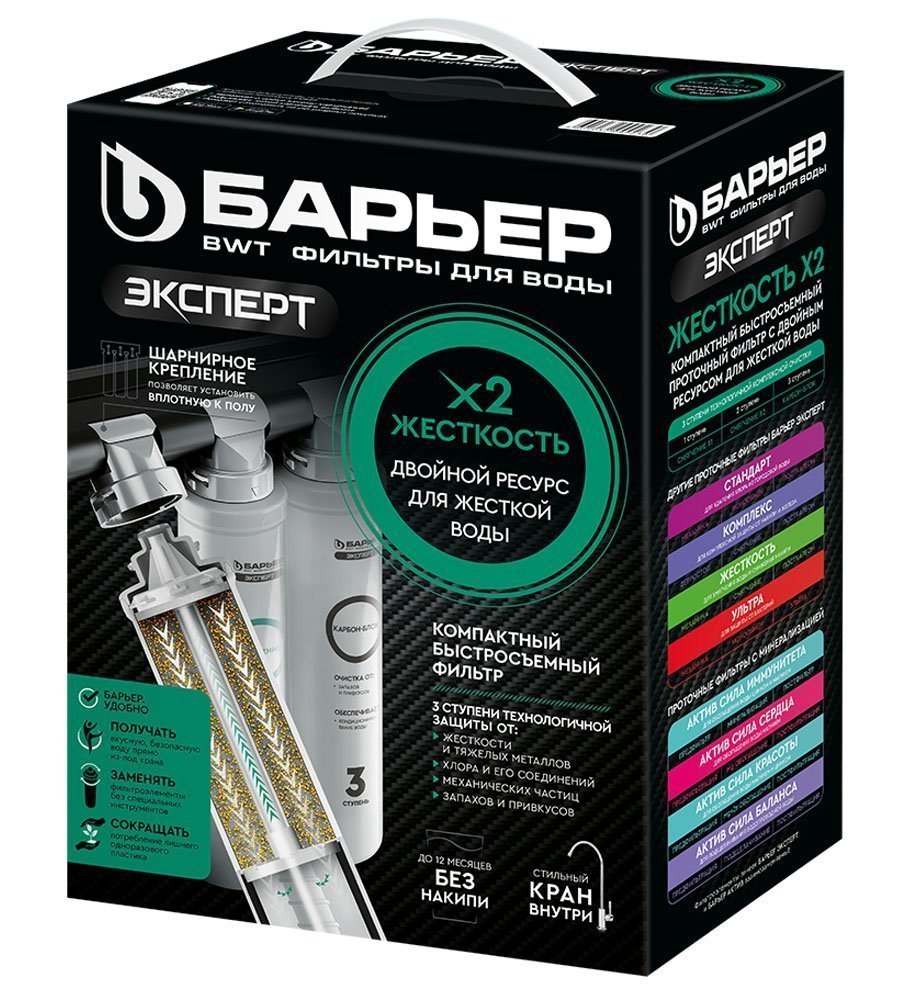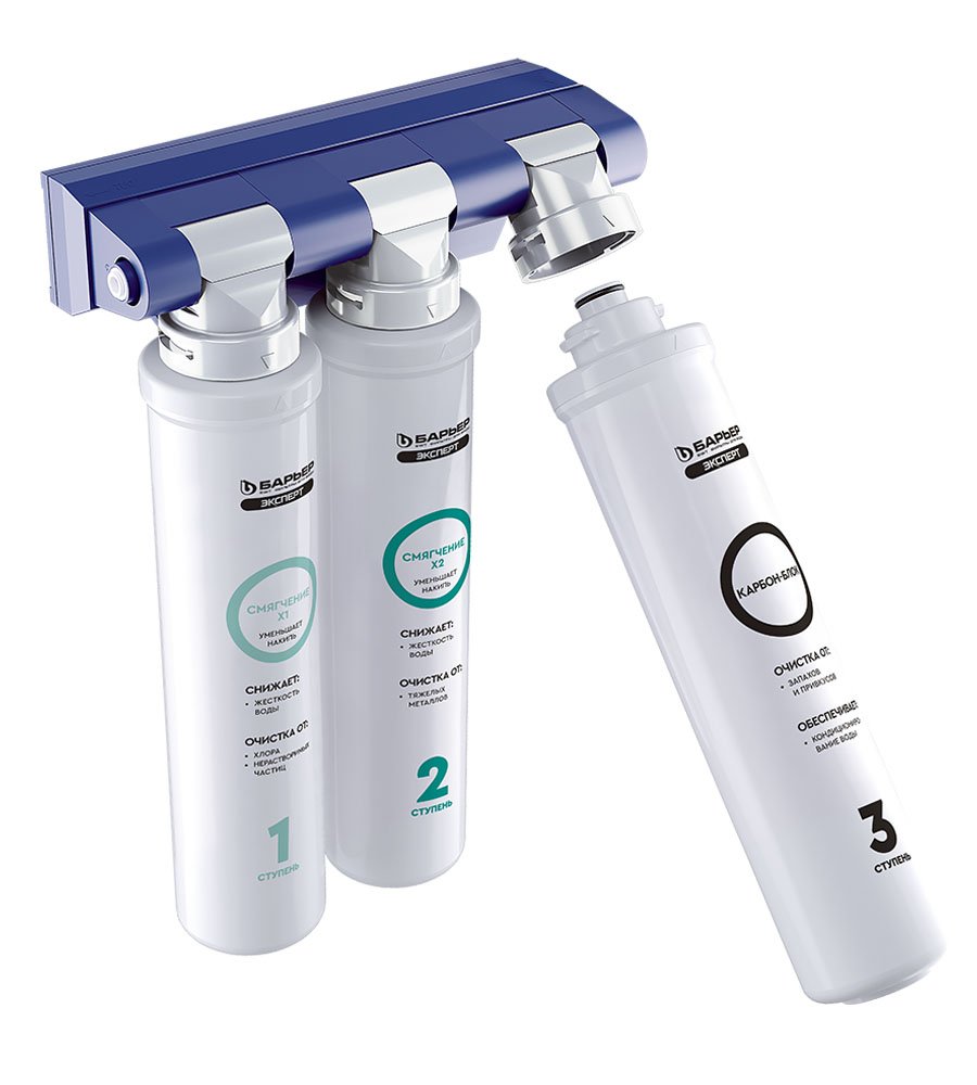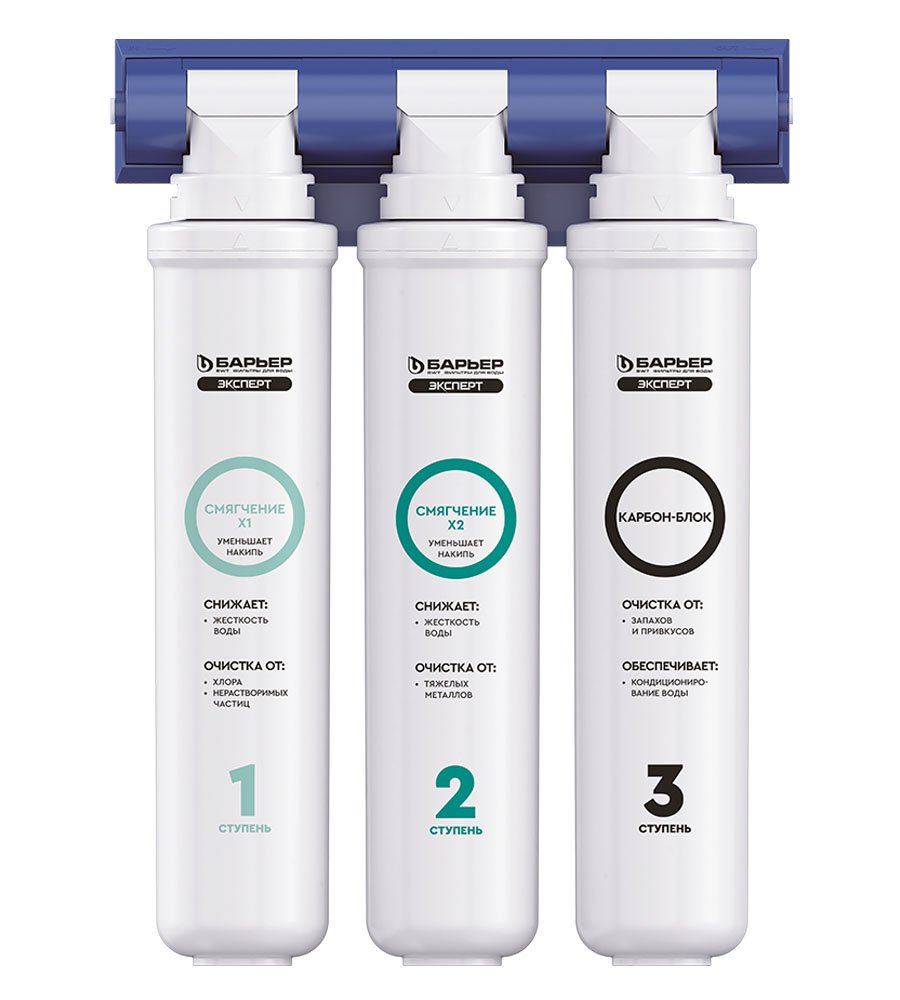 Фильтр трёхступенчатый для жесткой воды ЭКСПЕРТ Жесткость Х2 (быстросъём с подъёмом) подходит для жесткой городской воды. Не только умягчает воду, но и очищает ее от тяжелых металлов, хлора, посторонних привкусов и запахов. Производительность системы — 2 л/мин, ресурс до 12 месяцев.