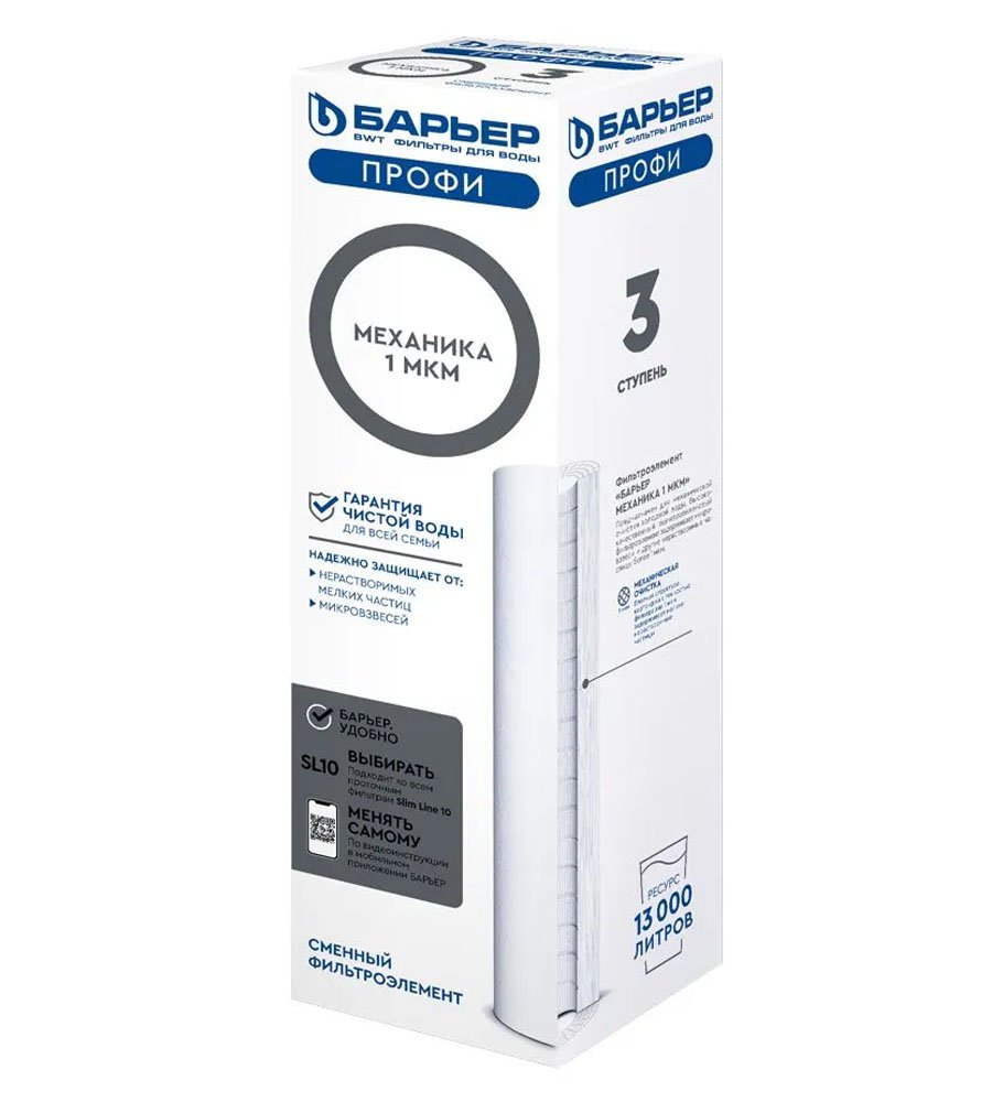 Картридж для механической очистки полипропилен 10SL 1 мкм для ХВС Механика БАРЬЕР задерживает механические примеси более 1 мкм (песок, ржавчину и др.).