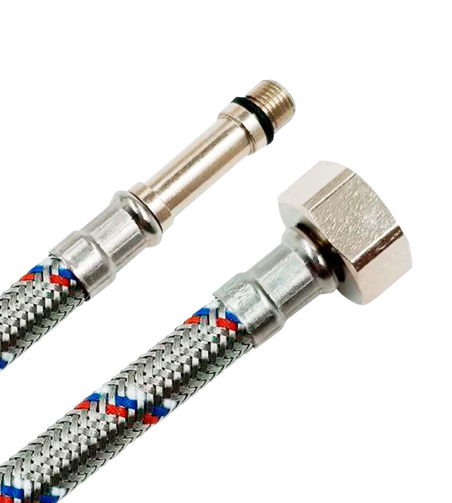 Оплетка выполнена из нержавеющей стали AISI 304 с белыми, синими и красными нитями, символически отмечающими российский бренд и типы водоснабжения (синие — холодная, красные — горячая вода).