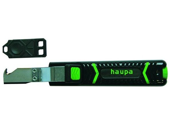 Инструмент для снятия оболочки HAUPA 200031 имеет лезвие в форме крюка, что делает рабочий процесс более удобным и эффективным. Нож подходит для использования со всеми распространенными типами кабелей с противосыростной изоляцией. Перестановка лезвия с кругового на продольное резание происходит автоматически.