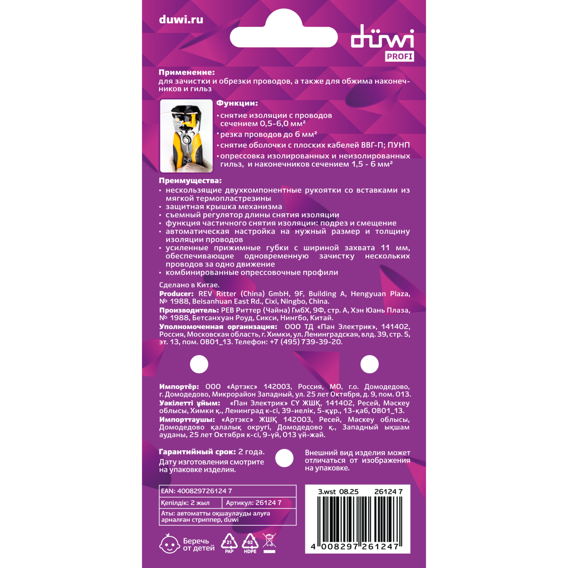 Инструмент для снятия изоляции duwi автоматический WS-04 PROFI 26124 7 используется для зачистки и обрезки проводов сечением от 0.5 до 6.0 мм² и снятия оболочки с плоских кабелей ВВГ-П, ПУНП. Данная модель поддерживает функцию обжима изолированных и неизолированных наконечников и гильз сечением от 0.5 до 6 мм² (ГСИ, НВИ, НКИ, НИК, НШКИ, НШПИ, изолированных разъемов).
