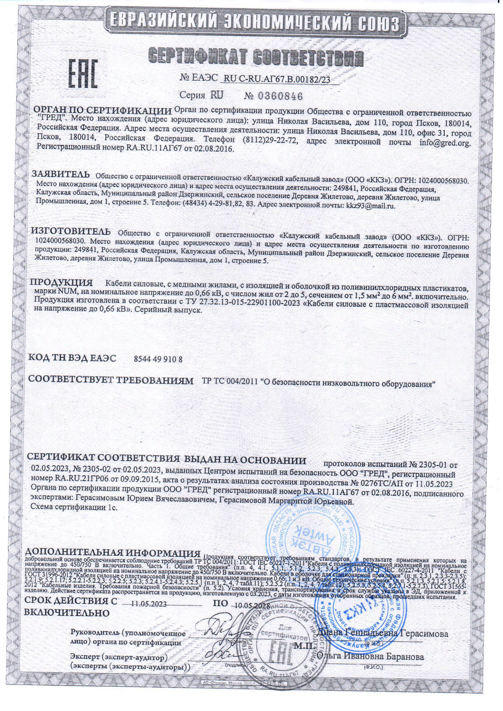 Кабель силовой NUM-J 3х2.5 Калужский кабельный завод (ККЗ) (ТУ по ГОСТ)