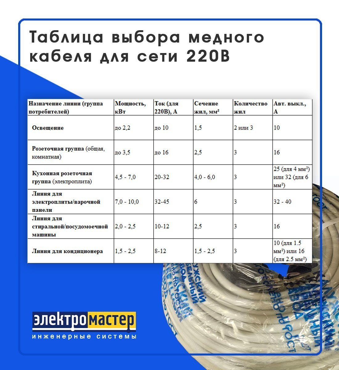 Таблица выбора медного кабеля для сети 220В