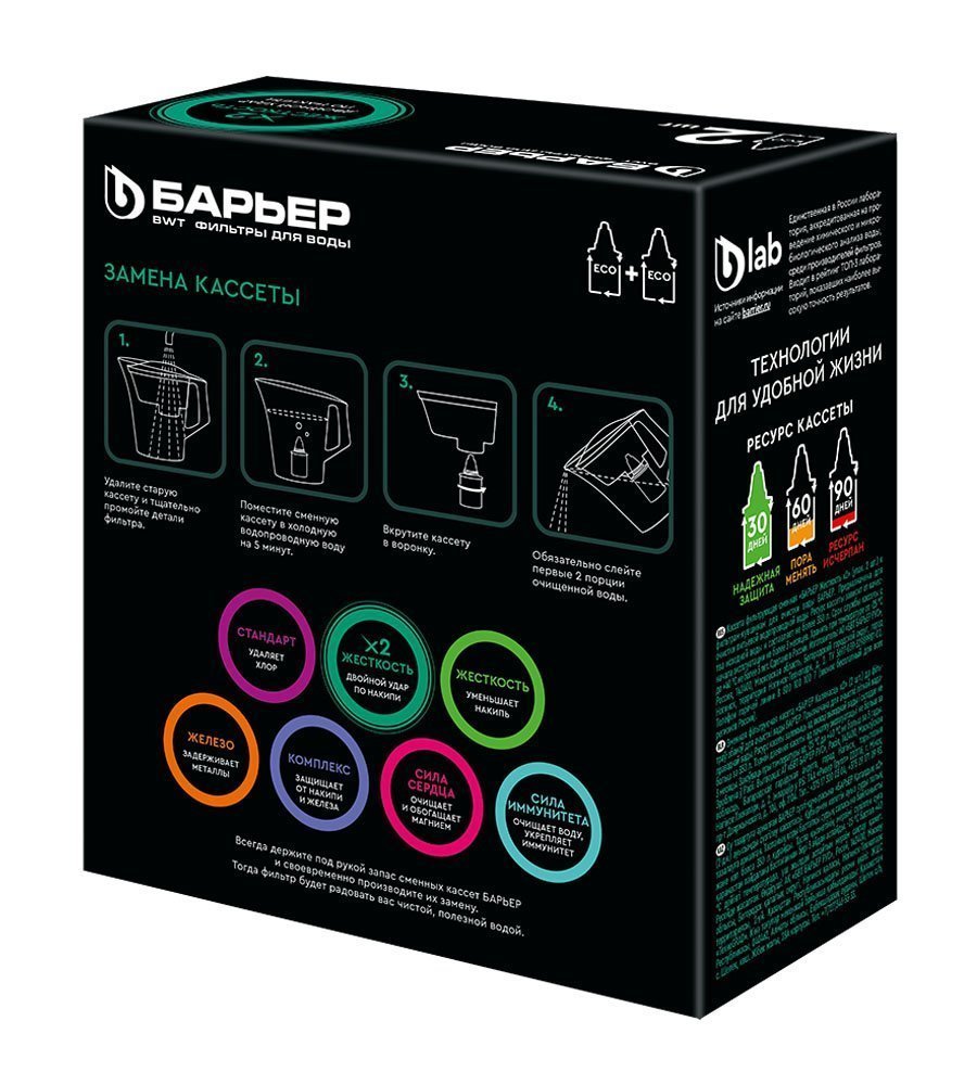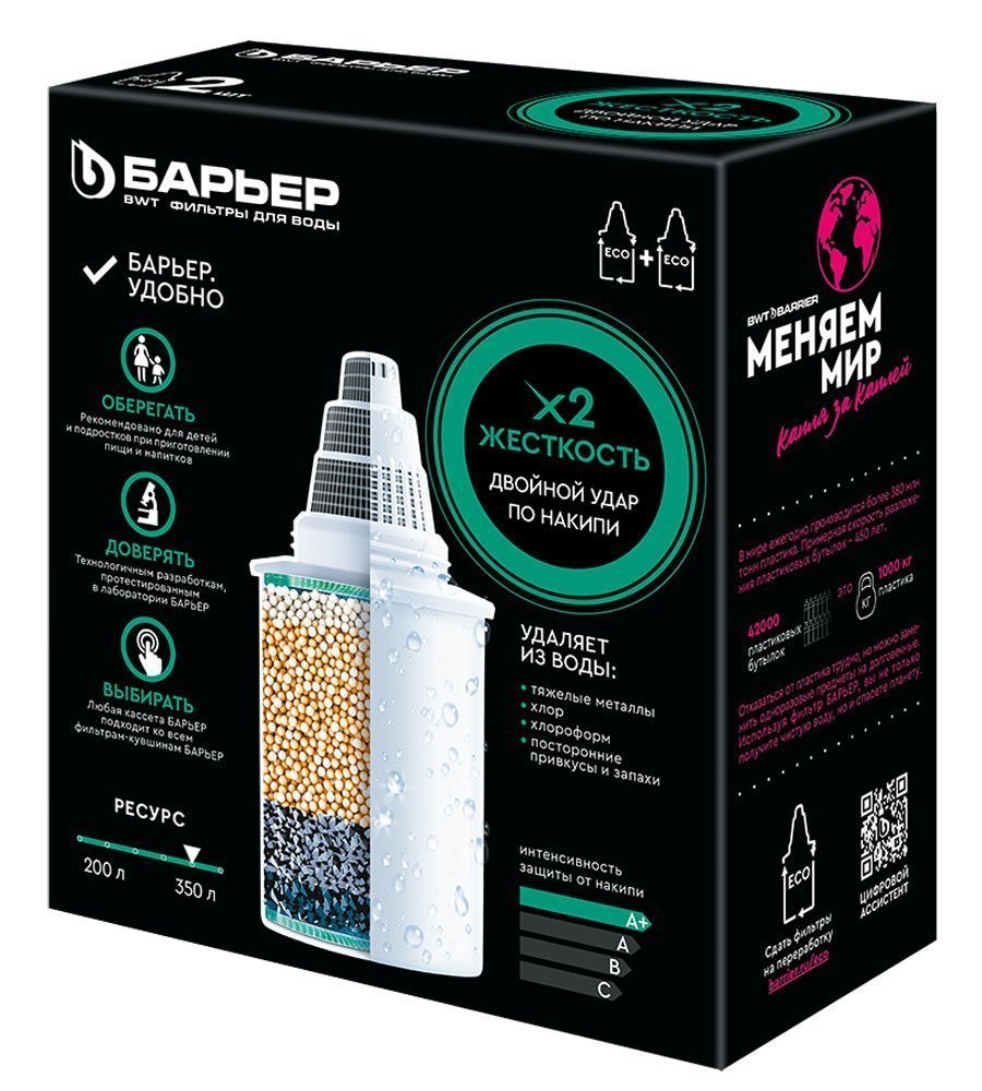 Комплект из 2 сменных кассет для фильтра БАРЬЕР Жесткость Х2. Специализированная очистка очень жесткой городской воды. Улучшенный состав засыпки позволяет менять кассету реже и дольше наслаждаться водой без накипи. Как и другие кассеты БАРЬЕР, Жесткость Х2 также удаляет хлор и его побочные продукты, тяжелые металлы, посторонние запахи и привкусы. Ресурс каждой кассеты — 350 литров.