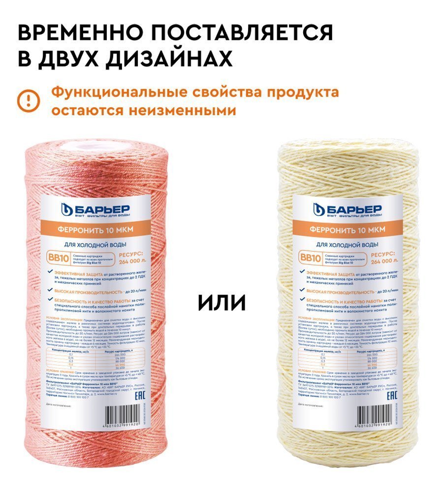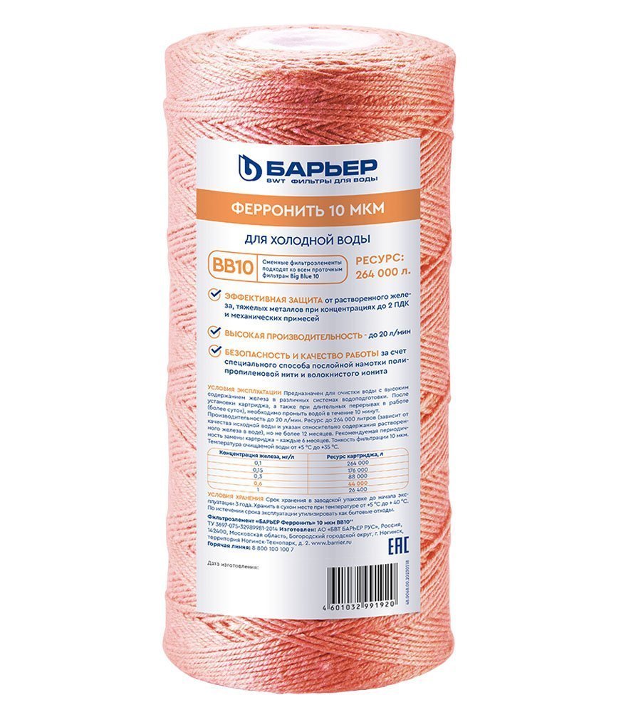 Картридж для удаления железа 10BB для ХВС ионообменный шнур ФерроНить БАРЬЕР эффективно удаляет механические частицы от 10 мкм, примеси растворенного и коллоидного железа, а также справляется с тяжелыми металлами. Внешний розовый слой – активированная нить, способная эффективно поглощать железо, марганец и другие тяжелые металлы. Внутренний белый слой – намотка специально обработанной полипропиленовой нити. Она задерживает мелкую взвесь, а также частицы нерастворенного железа.
