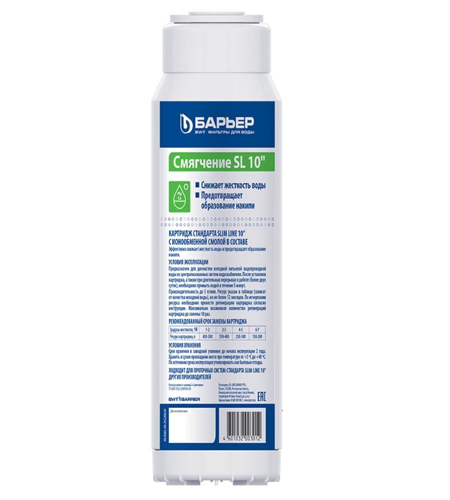 Картридж для умягчения воды 10SL для ХВС БАРЬЕР за счет действия ионообменной смолы пищевого класса снижает карбонатную жесткость воды —  причину образования накипи и налета на бытовых приборах и сантехнике, тем самым продлевает срок их службы.