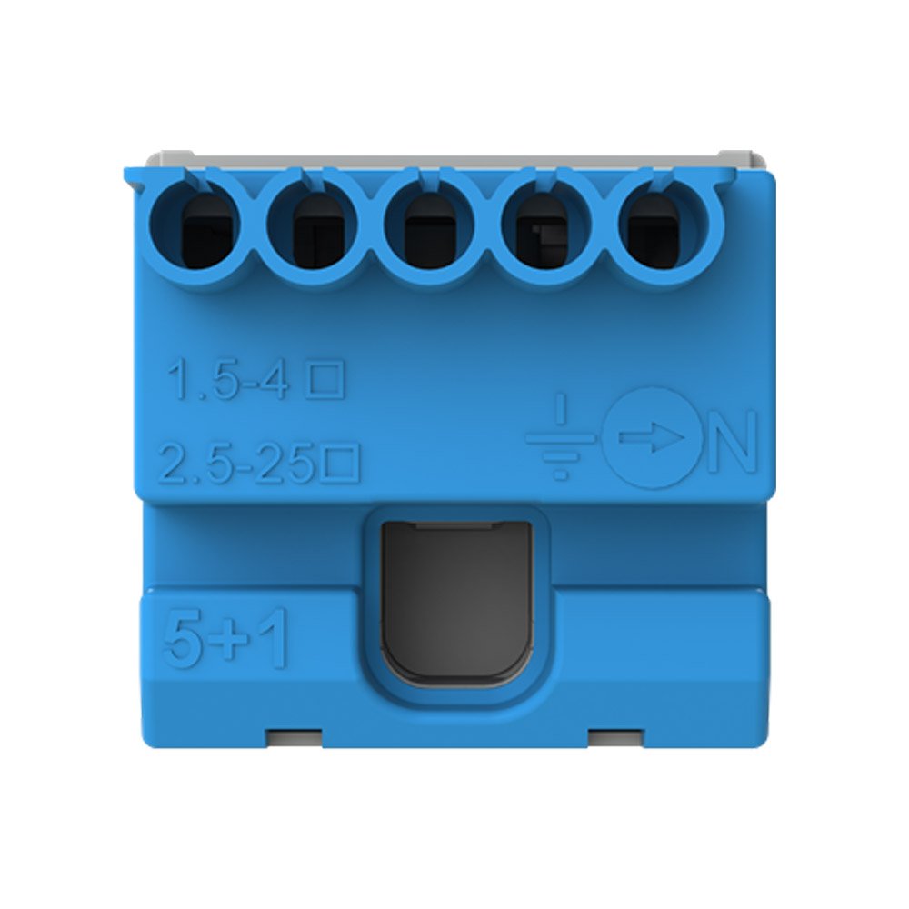 Клемный блок предназначен для коммутации жил проводов и кабелей, а также для соединения нулевого провода и провода заземления. Клеммные блоки выполнены в интуитивно понятных цветах: нейтраль (N) – синий, земля (PE) – зелёный.