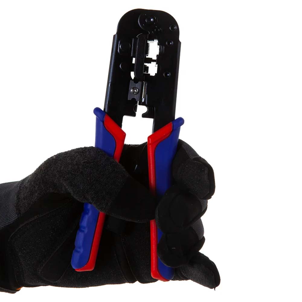 Клещи обжимные RJ (2 гнезда) RJ 11/12 (6-pin) RJ 45 (8-pin) 190мм KNIPEX качественно выполняет опрессовку штекеров типа Western. Облегчает работу рычажная передача, которая способствует увеличению усилия резания. Данный инструмент имеет вороненую поверхность, что предотвращает появление коррозии. Подходит для реза и снятия оболочки с плоских, неэкранированных телефонных кабелей, а также для удаления изоляции с круглых кабелей.