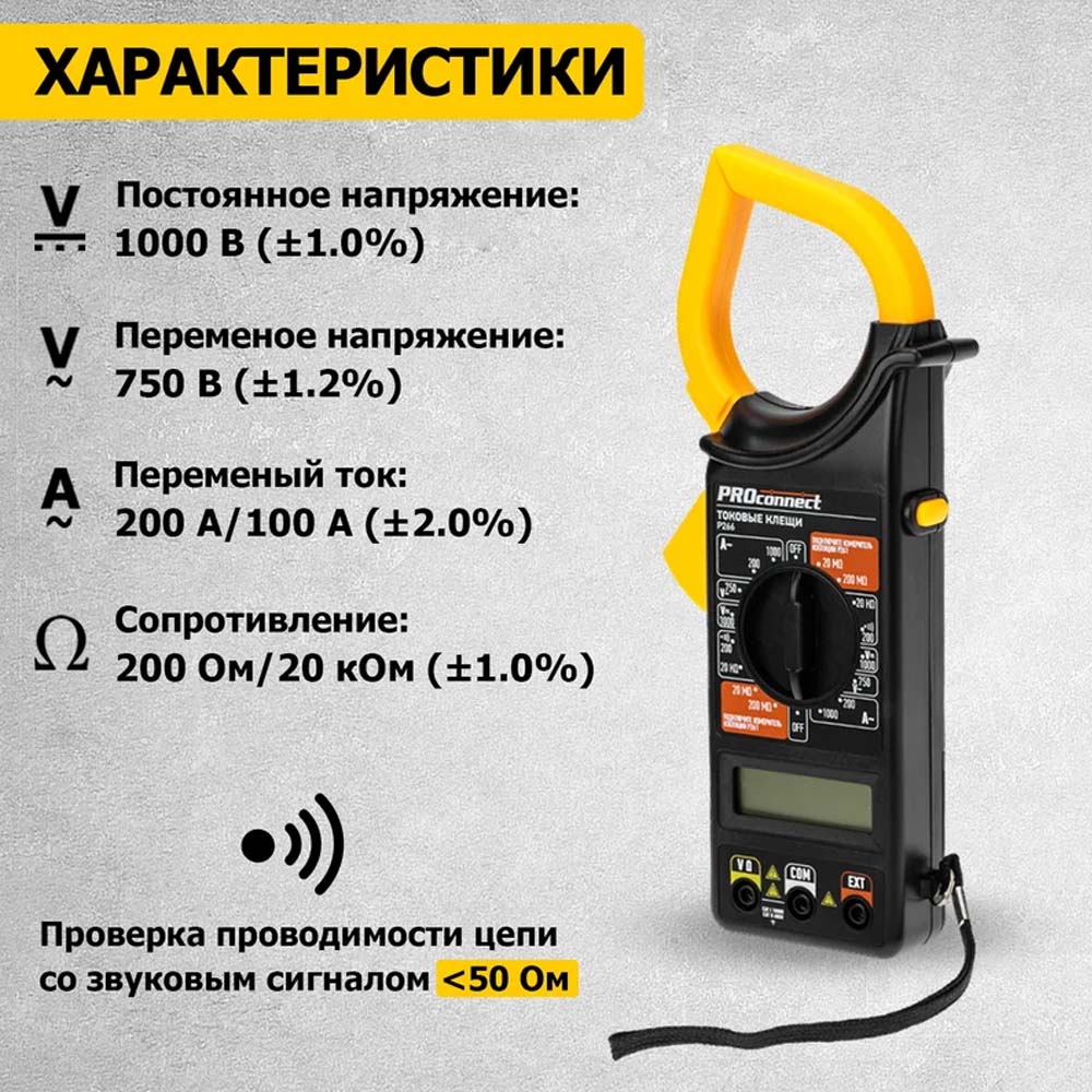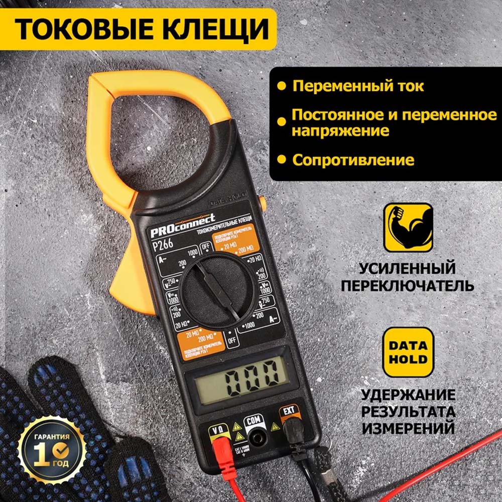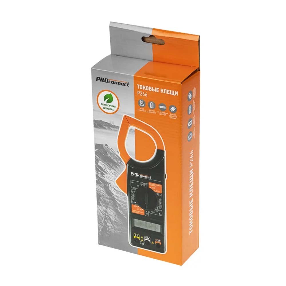 Токоизмерительные клещи серии P266 PROconnect являются многофункциональным прибором, с помощью которого можно измерить множество параметров. Кроме основной функции измерения переменного тока, с помощью P266 можно измерить постоянное и переменное напряжение, сопротивление. Токовые клещи P266 имеют функцию удержания результата измерений DATA HOLD для тех случаев, когда измерения проводятся в труднодоступных местах и не всегда есть возможность взглянуть на экран. Прибор изготовлен из высококачественных материалов и имеют эргономичный дизайн. Инженеры старались максимально упростить прибор и поэтому с ним легко работать даже одной рукой. Кроме того, у прибора усиленный переключатель, благодаря которому исключается возможность случайного нажатия.