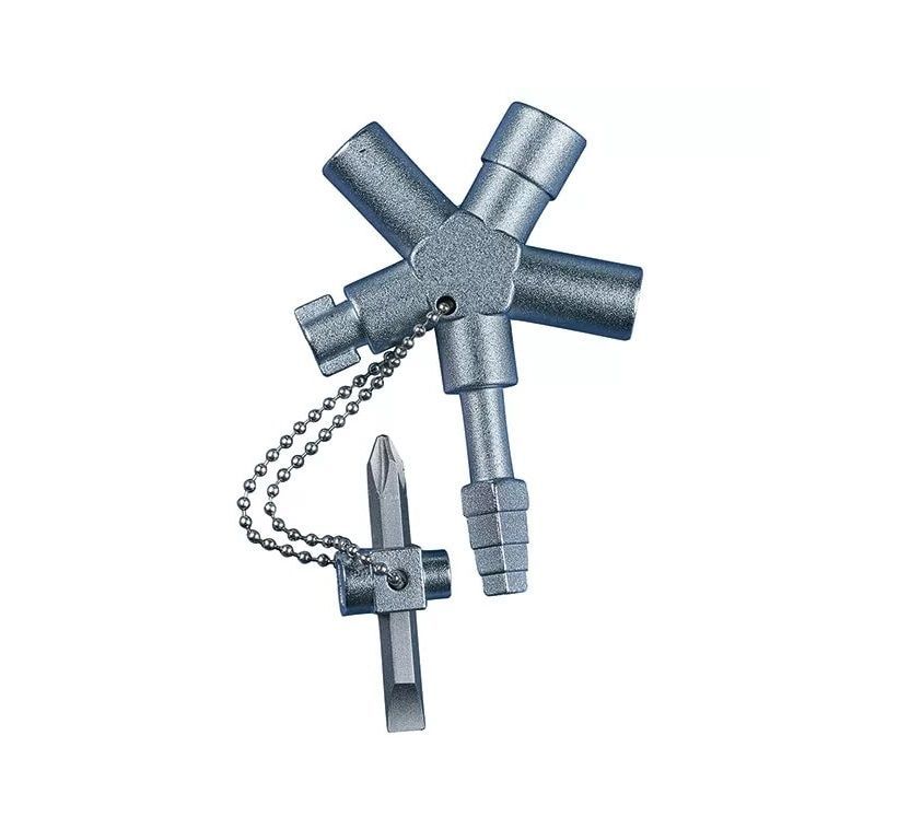 Универсальный ключ подходит для систем запирания в области электротехники, а также для специального применения в строительстве, сантехнике, системах вентиляции и кондиционирования. Изготовлен из цинкового литья под давлением. Профили входящие в комплект: внутренний четырехгранник 6 - 7 мм, 8 - 9 мм, Внешний четырехгранник 5 - 10 мм, двойная бородка 3-5мм, внутренний трёхгранник 7-9 мм, внутренний трёхгранник 11 мм, бита РН и шлиц с внутренним квадратом на 5 мм и полумесяцем на цепочке.