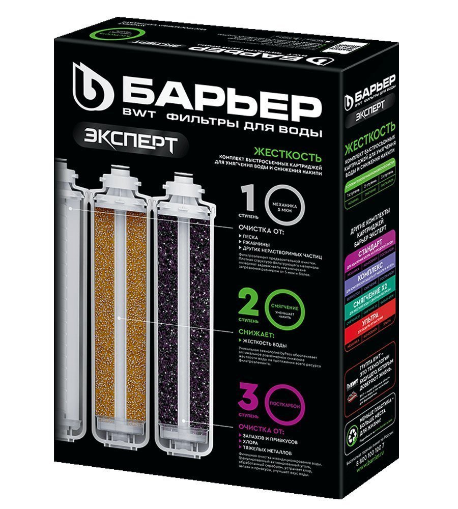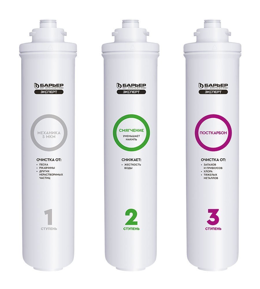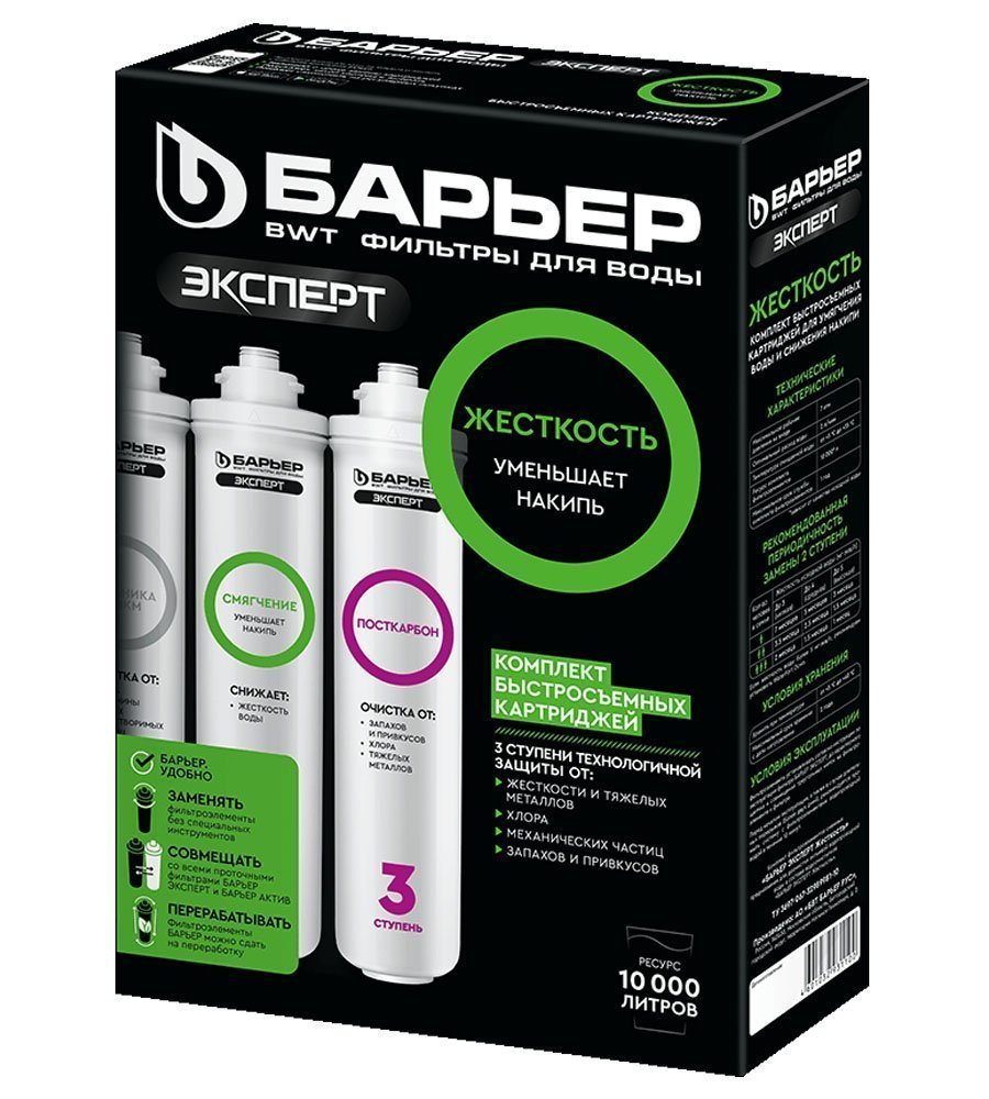 Сменные быстросъемные картриджи для проточного фильтра БАРЬЕР ЭКСПЕРТ. Комплект сменных картриджей БАРЬЕР ЭКСПЕРТ Жесткость позволяет забыть о накипи в чайнике, очищает воду от тяжелых металлов, хлора, посторонних привкусов и запахов. Производительность — 2 л/мин, ресурс — 10 000 литров.