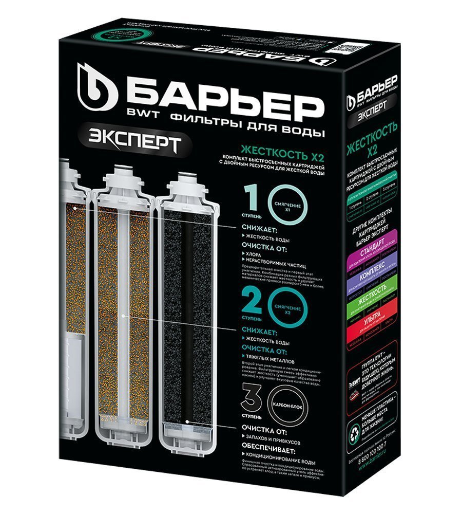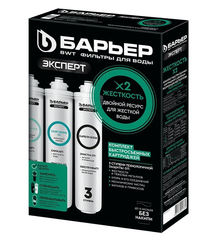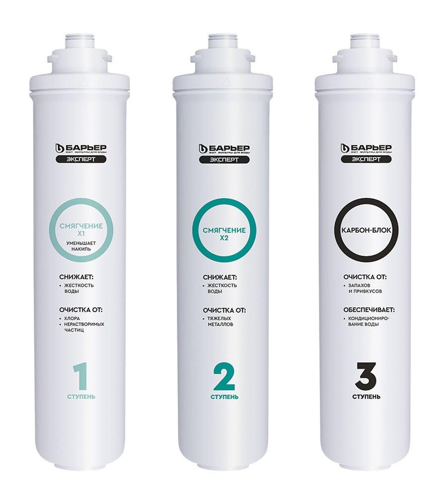 Сменные  быстросъемные картриджи для проточного фильтра БАРЬЕР ЭКСПЕРТ. Комплект сменных картриджей БАРЬЕР ЭКСПЕРТ Жесткость х2 для жесткой городской воды обладает повышенным ресурсом против накипи и позволяет забыть об осадке в чайнике на целый год.