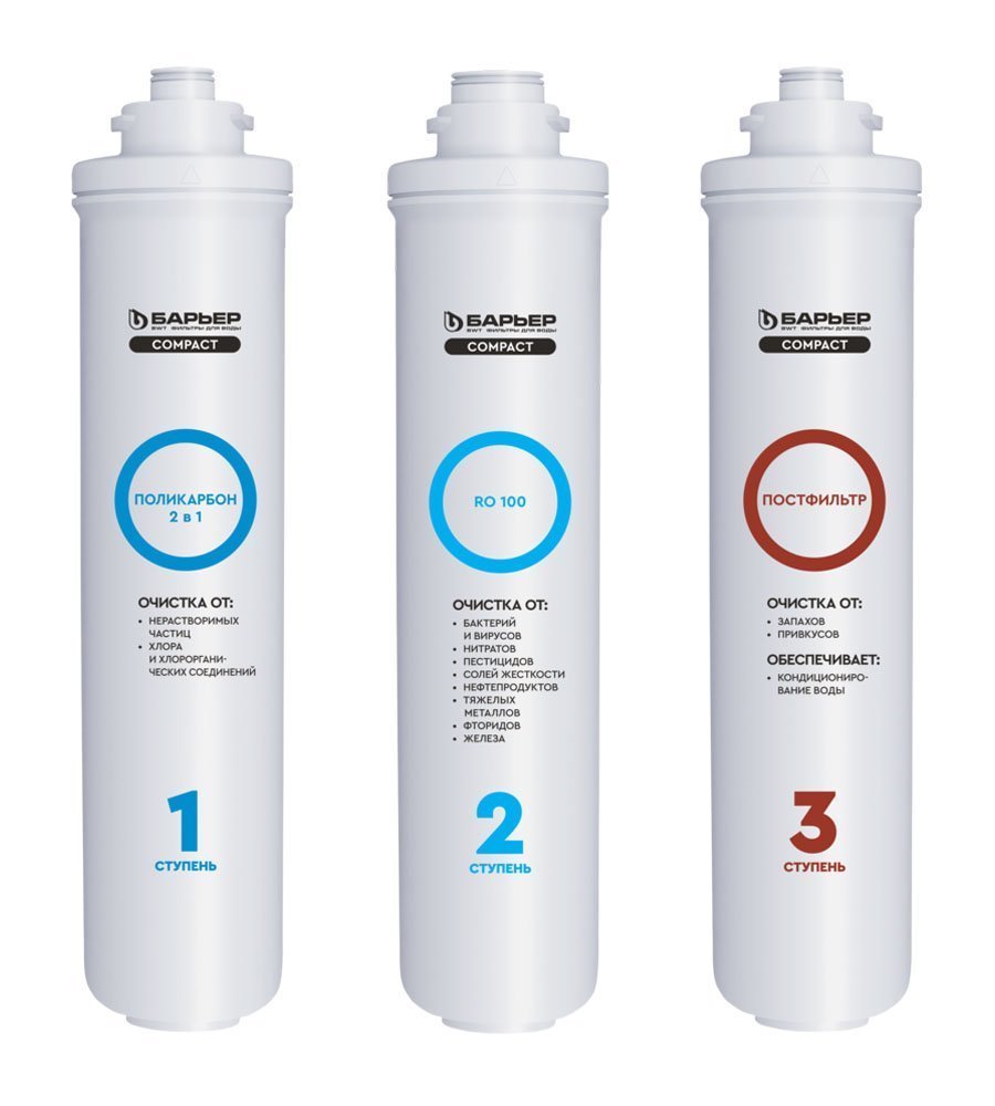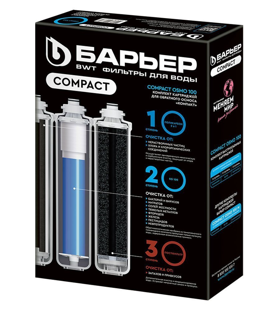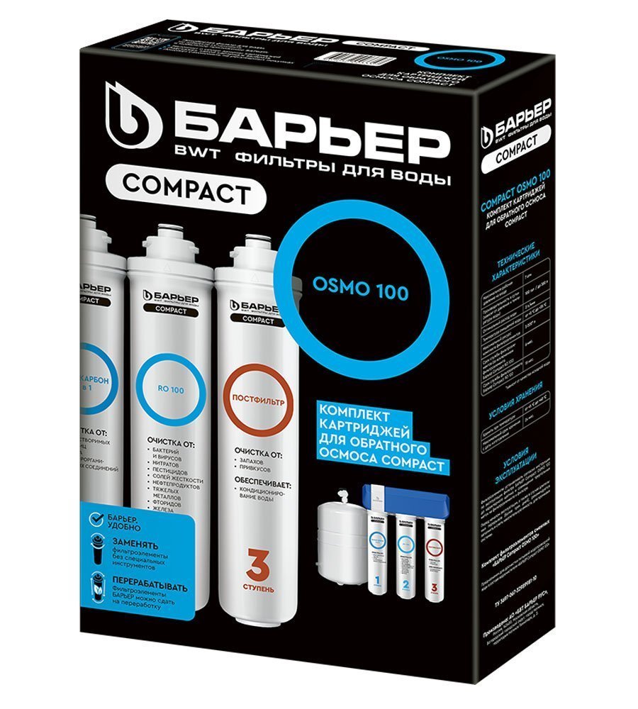 Комплект картриджей совместим ТОЛЬКО с фильтром БАРЬЕР Компакт ОСМО 100. Не требует для замены специальных ключей, инструментов или навыков.
