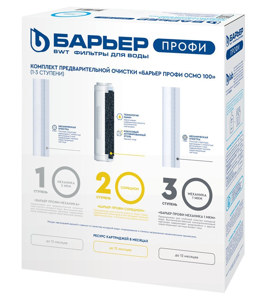 Комплект картриджей ПРОФИ ОСМО Предфильтр (1-3 ступени обратный осмос) БАРЬЕР устанавливается в качестве 1-3 ступеней, подготавливает воду к мембране. Совместим с фильтрами обратного осмоса других производителей стандарта SL 10. Ресурс комплекта — 20 000 литров. Рекомендуемая периодичность замены — 1 раз в 6 месяцев.
