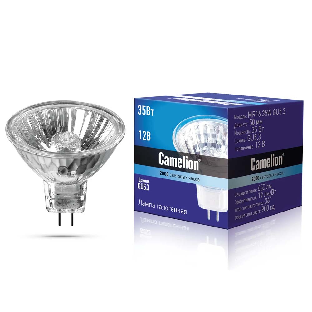 Лампа галогенная MR-16 35Вт 3000К 650Лм GU5.3 12В Camelion используется для точечного и акцентного освещения в помещениях.