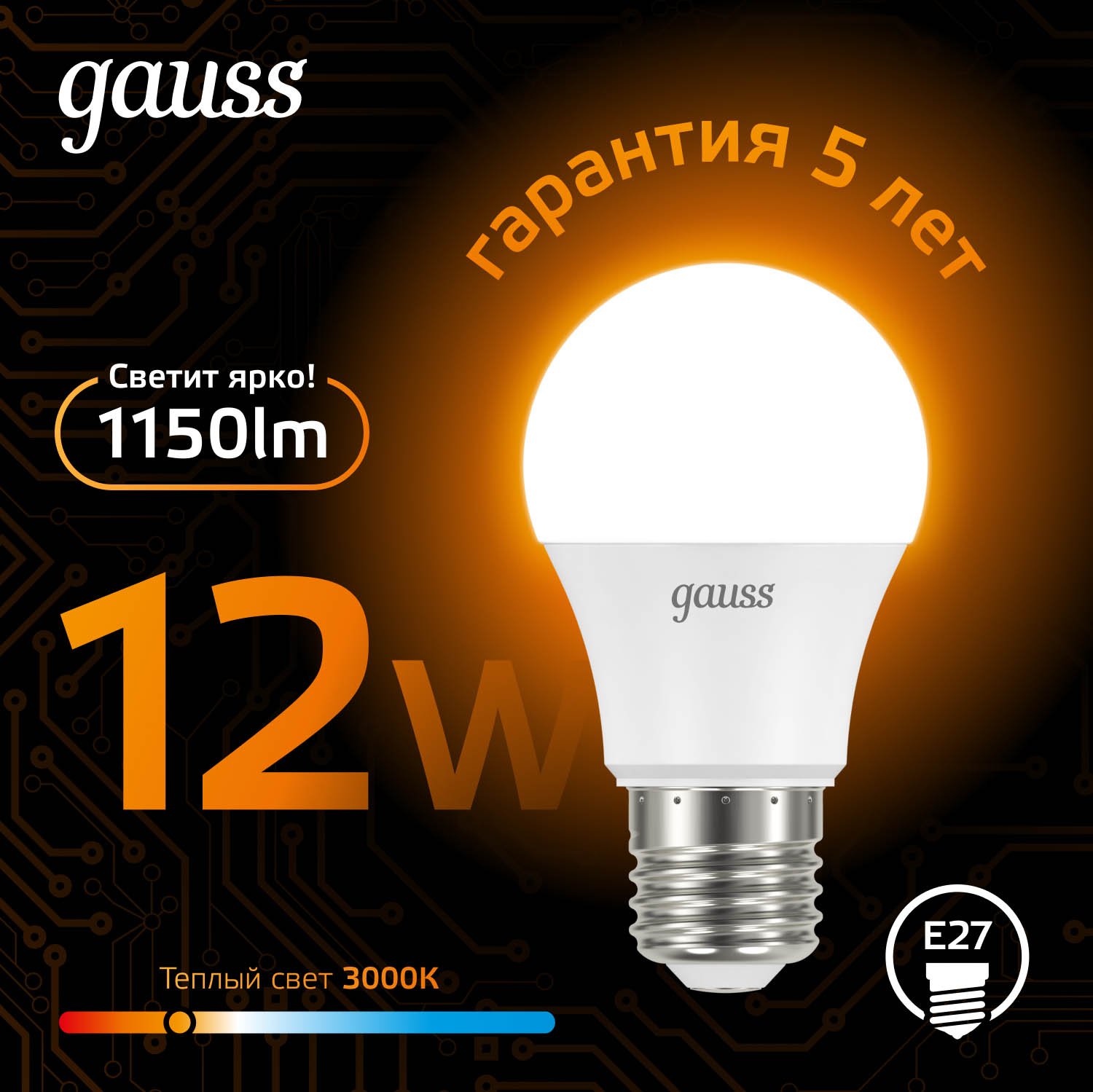 Лампа светодиодная А60 12Вт 3000K 1150Лм Е27 Gauss предназначена для освещения помещений общественного назначения.