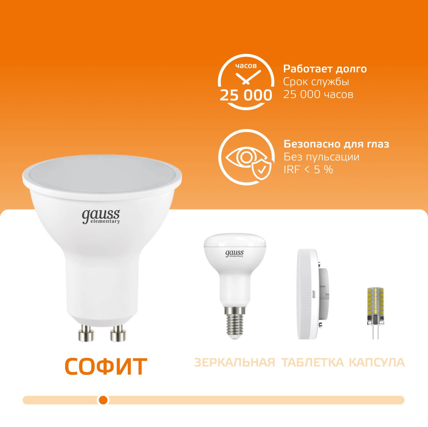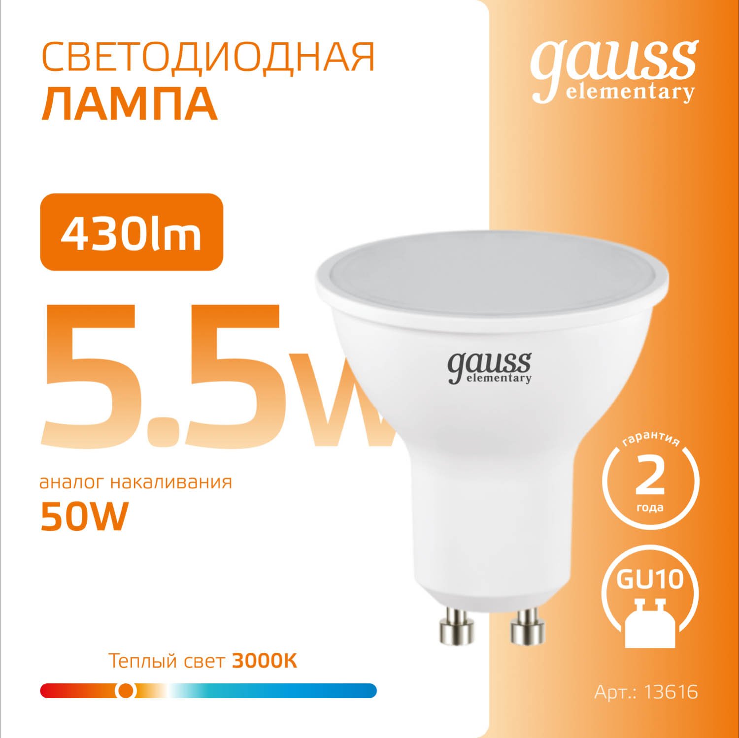 Лампа LED 5.5Вт=50Вт GU10 MR16 2700K 220V 430Лм Gauss Elementary предназначена для оформления и освещения помещений.