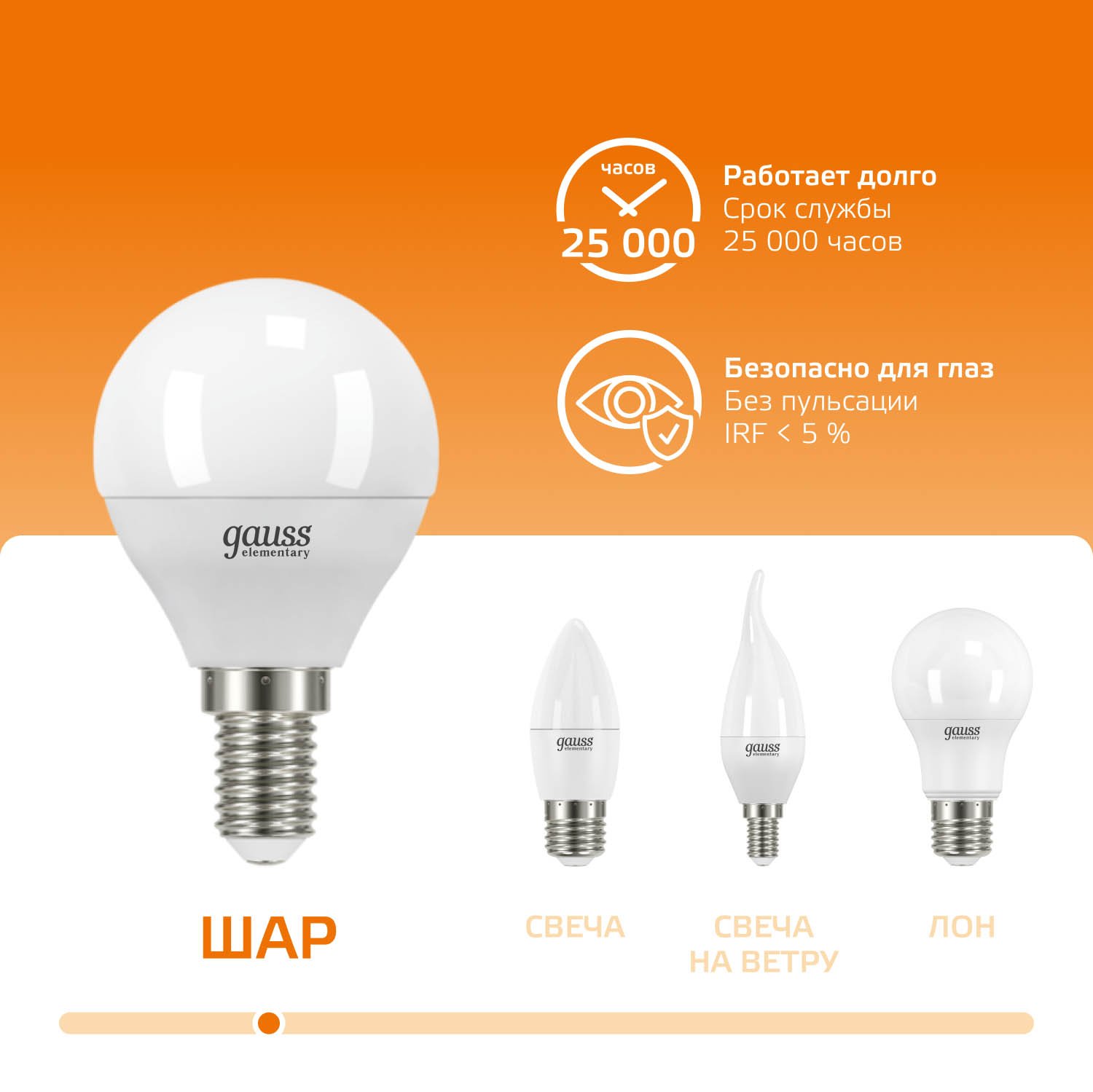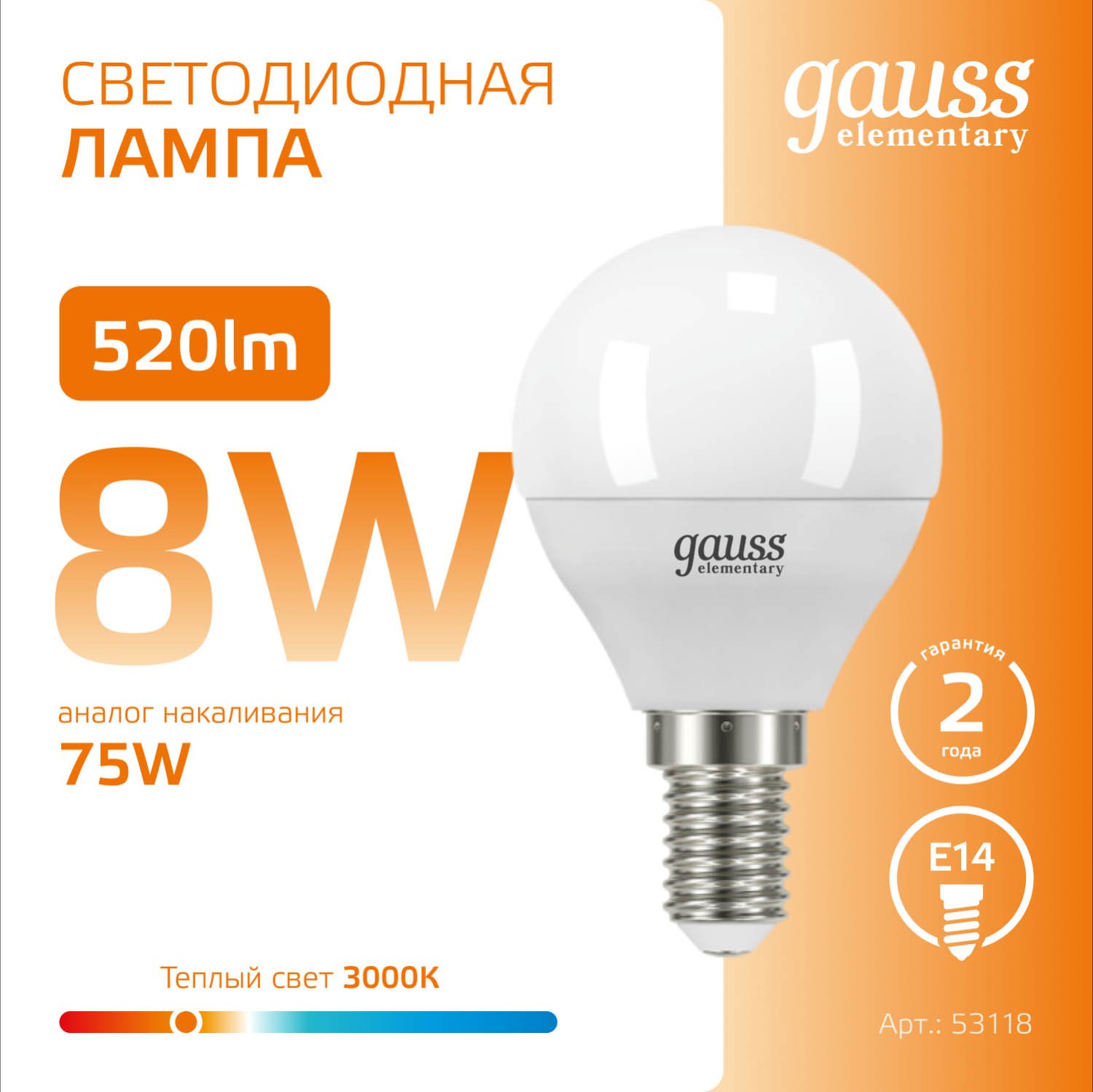 Лампа LED 8Вт=75Вт E14 3000K 520Лм шар Gauss Elementary предназначена для оформления и освещения помещений.
