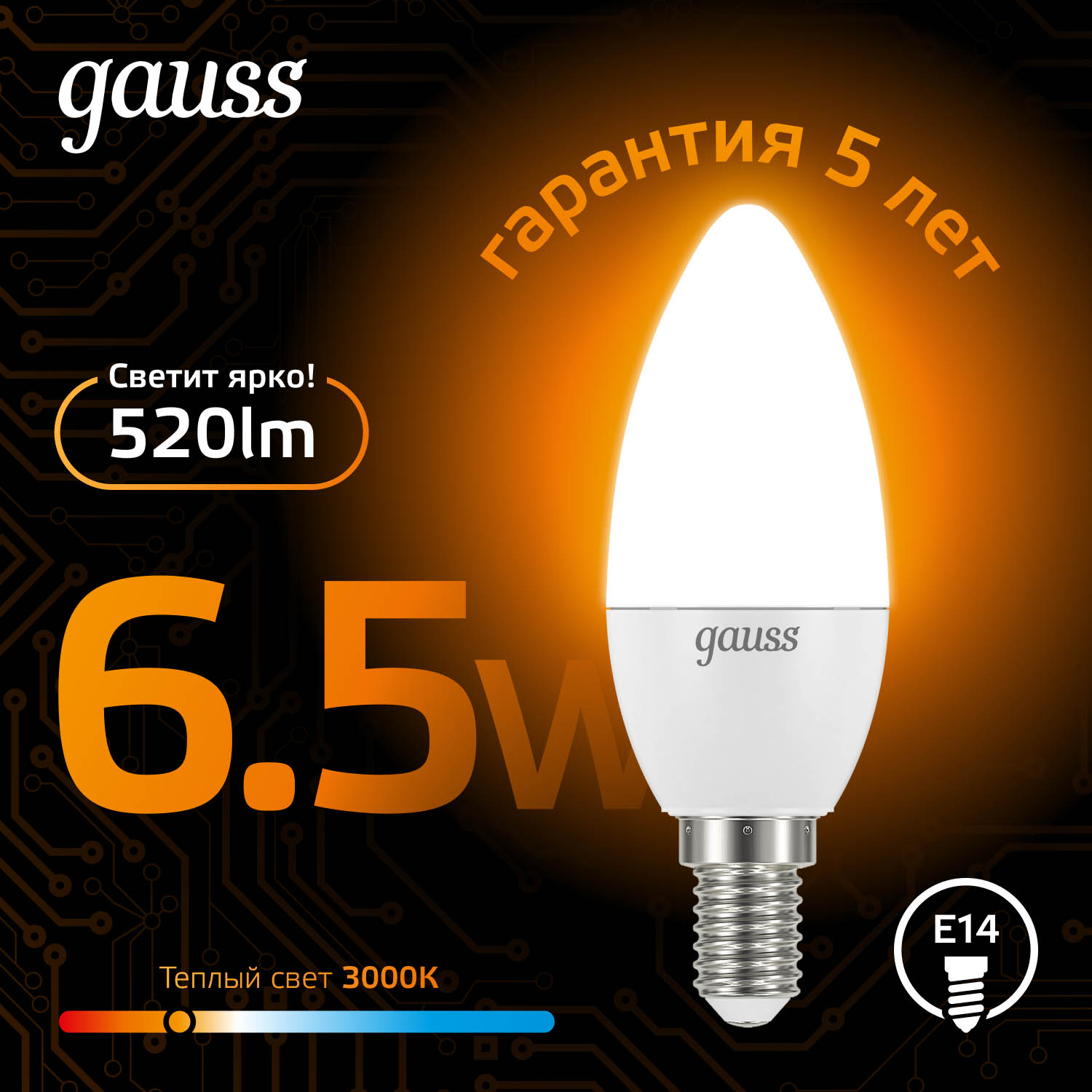 Лампа светодиодная свеча C37 6.5Вт 3000К 520Лм Е14 GAUSS предназначена для общего и декоративного освещения помещений различного назначения.