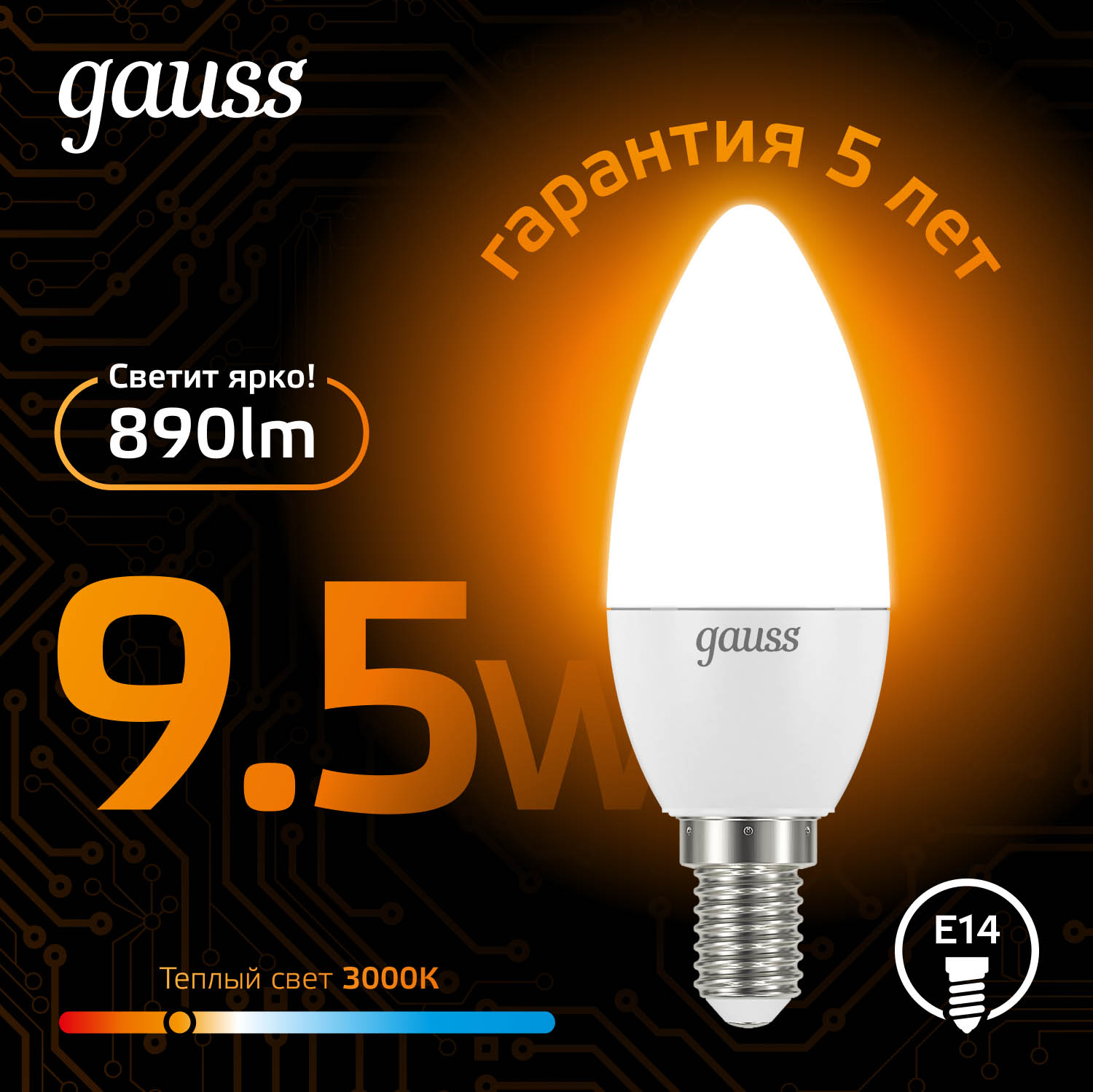 Лампа LED 9.5Вт=95Вт E14 3000K 890Лм свеча Gauss предназначена для общего и декоративного освещения помещений различного назначения.