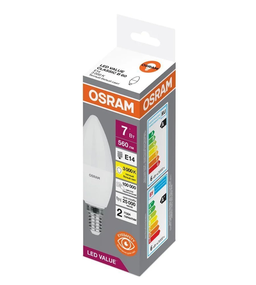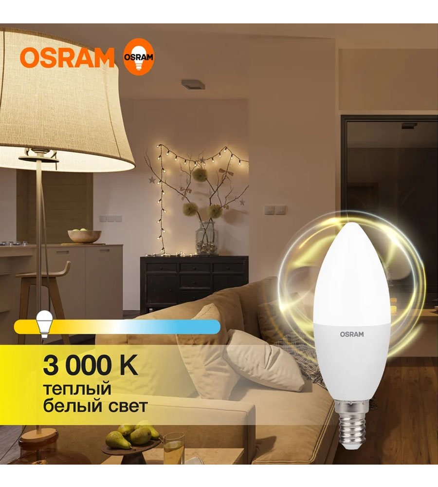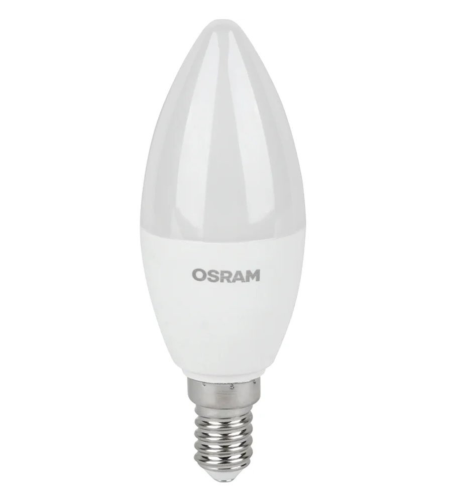 Лампа светодиодная свеча LED Value 7Вт=60Вт E14 827 560 Лм OSRAM применяется для внутреннего освещения, в закрытом светильнике можно использовать и на улице.