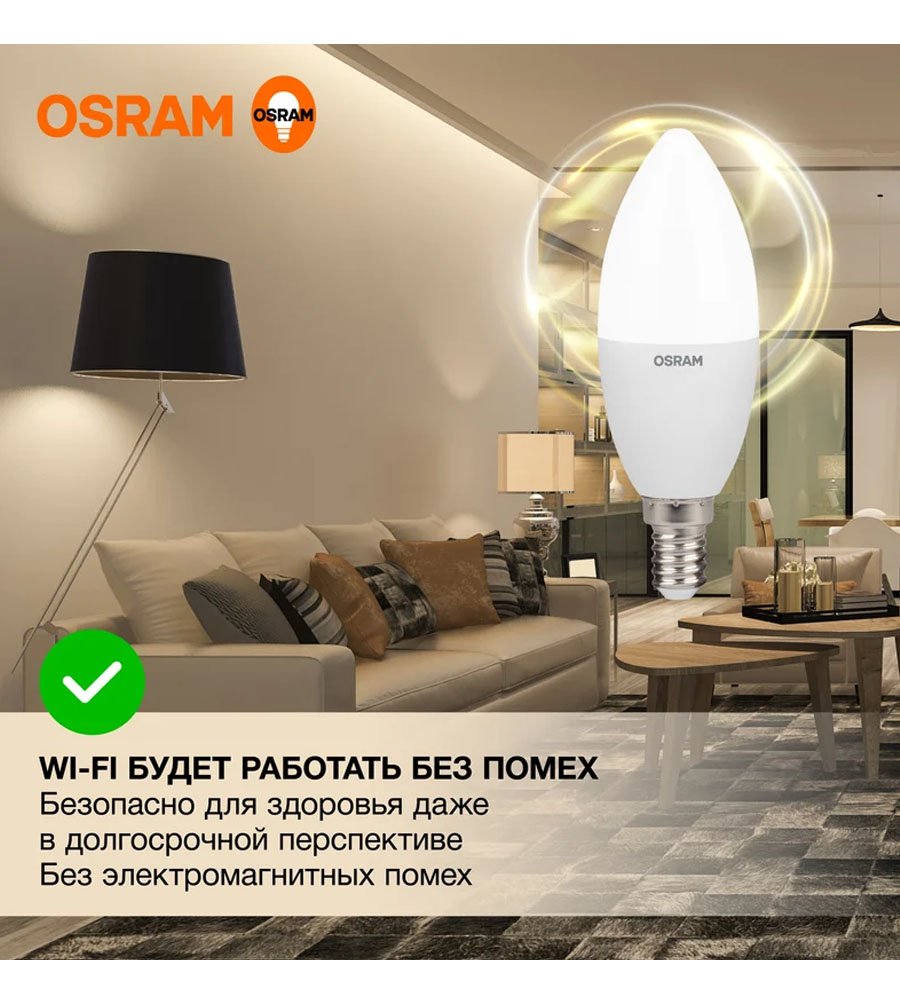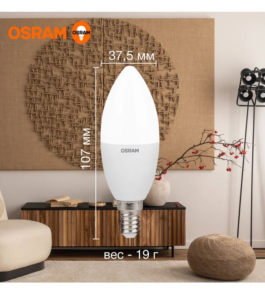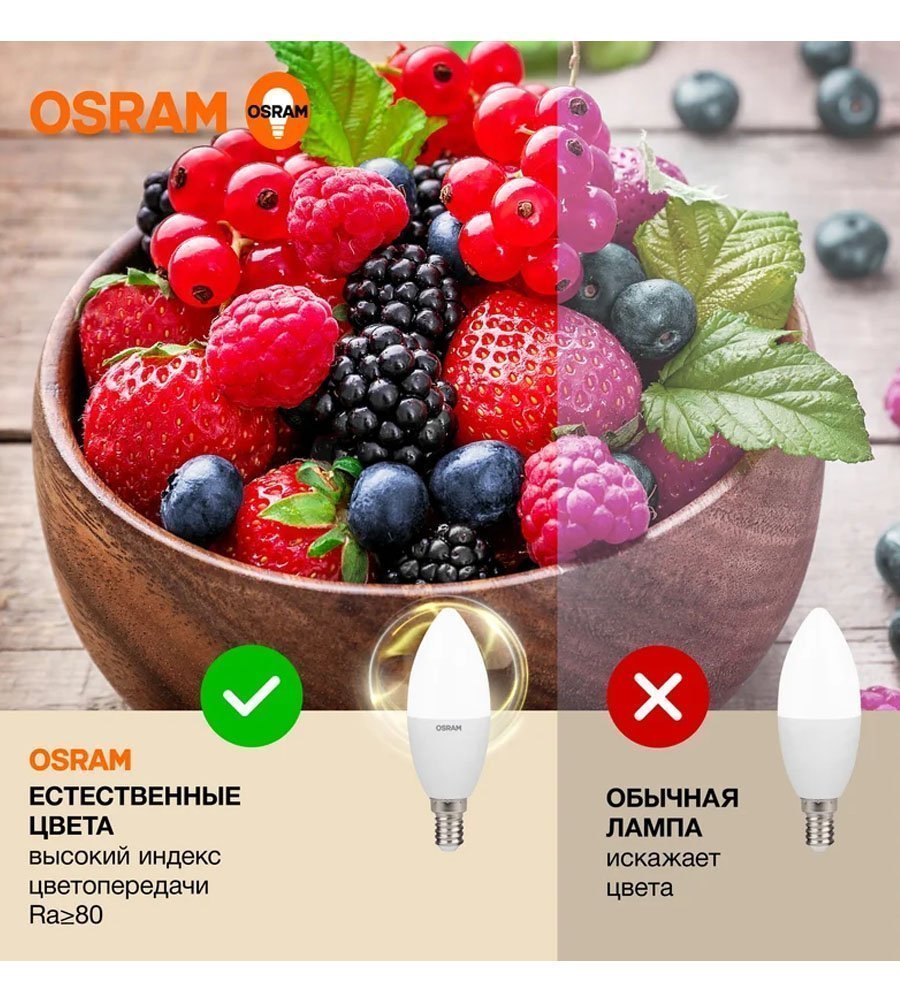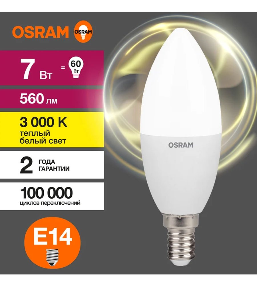 Лампа светодиодная свеча LED Value 7Вт=60Вт E14 827 560 Лм OSRAM применяется для внутреннего освещения, в закрытом светильнике можно использовать и на улице.