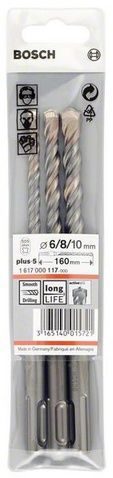 Набор буров по бетону хвостовик SDS-Plus 1617000117 3 предмета BOSCH предназначен для ударно-вращательного сверления отверстий в сплошном и ячеистом бетоне, твёрдом бетоне, кирпиче, строительном камне, керамике, мраморе различных диаметров в зависимости от выбранного размера сверла.