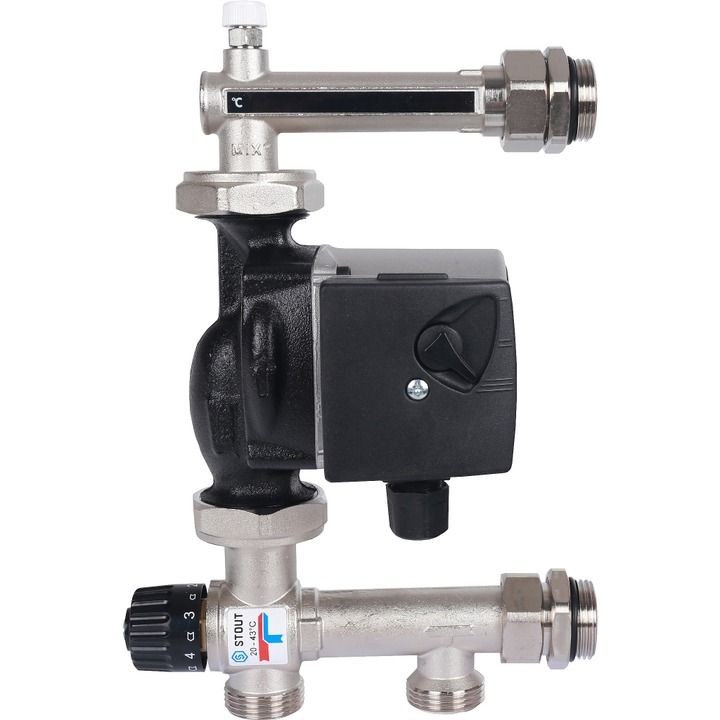 Насосно-смесительный узел с термостатическим клапаном 20-43°C. с насосом UPSO 25-65. 130 mm STOUT SDG-0120-005001 предназначен для обеспечения циркуляции и поддержания температуры подающего  теплоносителя  на  постоянном  уровне  20-43°С  в  низкотемпературных  системах отопления типа «теплый пол».