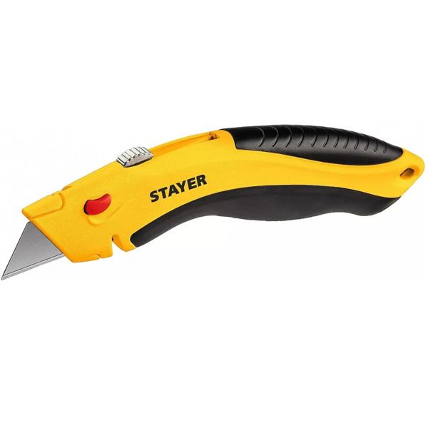 Универсальный нож STAYER с трапециевидным лезвием для реза различных материалов с применением значительных усилий (линолеум, ковровые покрытия, гипсолитовые плиты, гипсокартон, кровельные материалы, пластик, дерево).