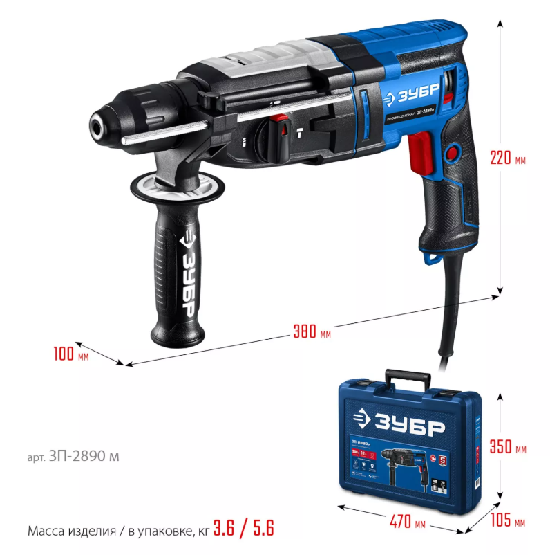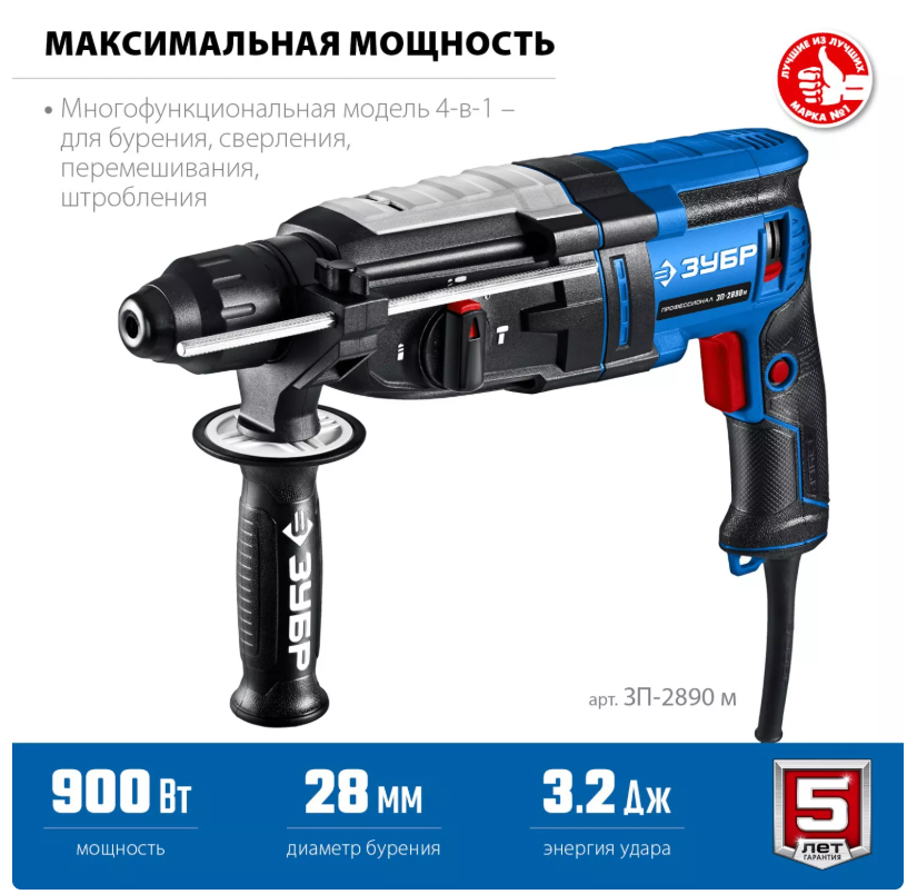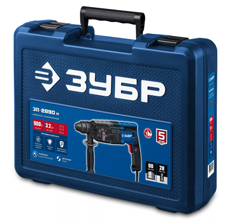 Перфоратор 900Вт Max 28мм 3.2 Дж SDS Plus мет. корпус. Профессионал ЗУБР (ЗП-2890 М) для сверления и бурения в бетоне, долбежных работ, перемешивания ЛКМ при установке соответствующего расходного инструмента.