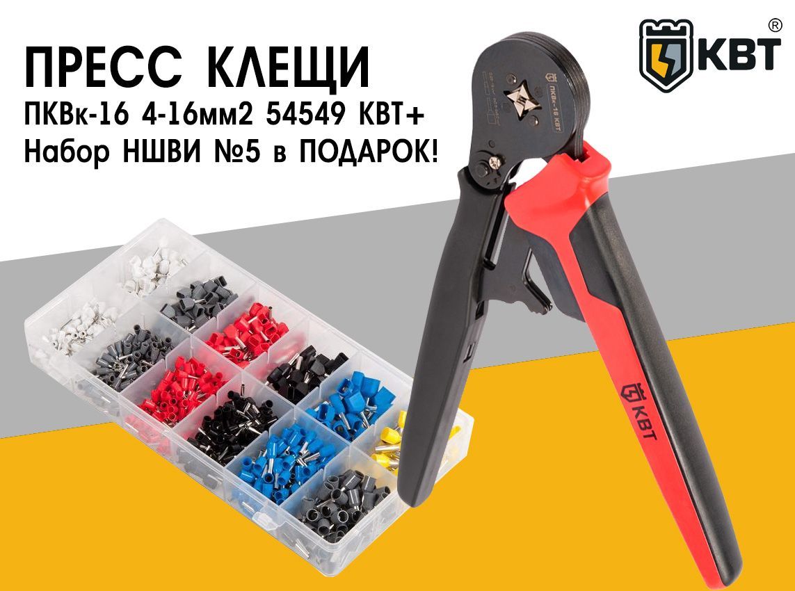 Пресс-клещи ПКВк-16 4-16мм2 54549 КВТ в рамках акции комплектуются набором НШВИ №5 79493 КВТ. Стоимость подарка со скидкой составит всего 1 рубль! Ссылка на инструмент без набора