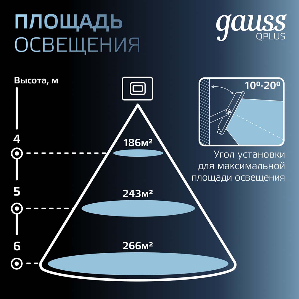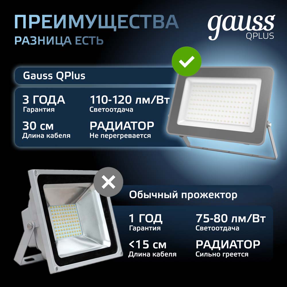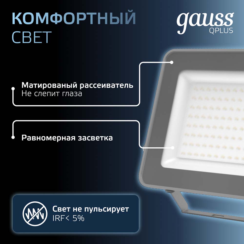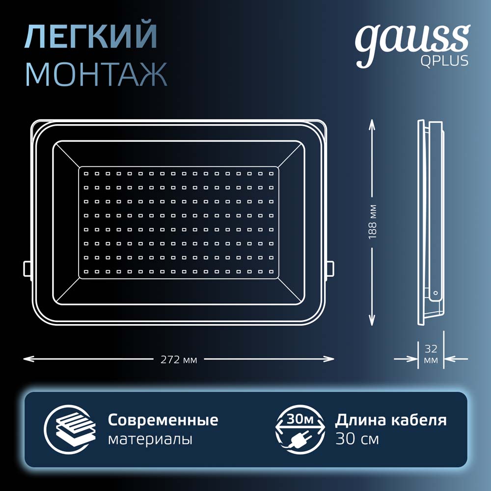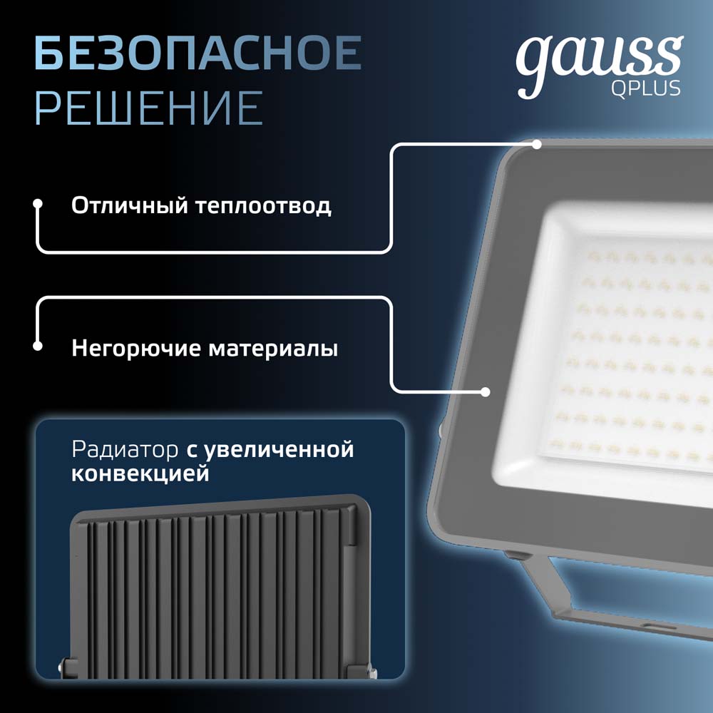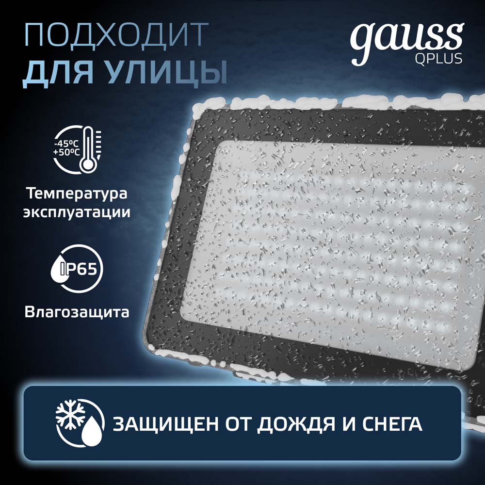 Прожектор светодиодный 100Вт 6500К 10500Лм IP65 GAUSS  Qplus графит предназначен для освещения крупногабаритных помещений и объектов, требующих мощной подсветки. Это могут быть производственные или спортивные площадки, автостоянки, а также фасады зданий.