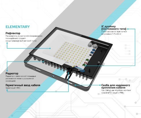 Корпус прожектора изготовлен из прочного литого алюминия, рассеиватель выполнен из прозрачного закаленного стекла. Экономичная LED технология сокращает до 90% затрат на электроэнергию. Использование надежного нелинейного интегрированного драйвера гарантирует работу практически в любых условиях, отсутствие электромагнитных помех и высокий коэффициент мощности более 0,9. Материалы изготовления и конструкция прожекторов Elementary обеспечивают их высокую механическую прочность и полную защиту от пыли и влаги по классу IP65.