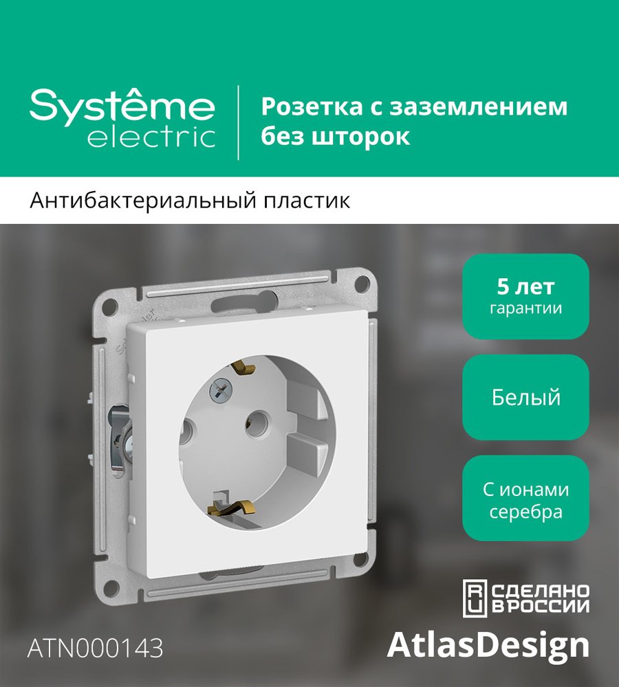 Механизм Systeme Electric (ранее Schneider Electric) серии AtlasDesign в цвете белый розетки одинарной с заземлением и без шторок подходит для сетей 250 В, на ток 16 А. Пластик с ионами серебра в белом цвете обеспечивает антибактериальный эффект. Заземляющий контакт обеспечивает дополнительную защиту от удара электрическим током. При наличии заземления электрический потенциал уходит в землю, защищая человека. Лицевые детали из качественного ABS-пластика, устойчивого к царапинам и УФ-излучению.