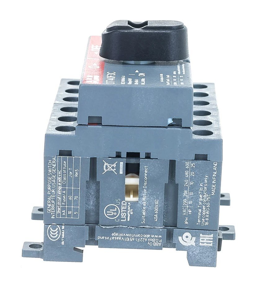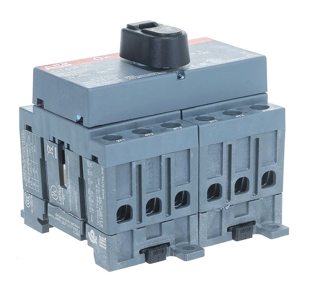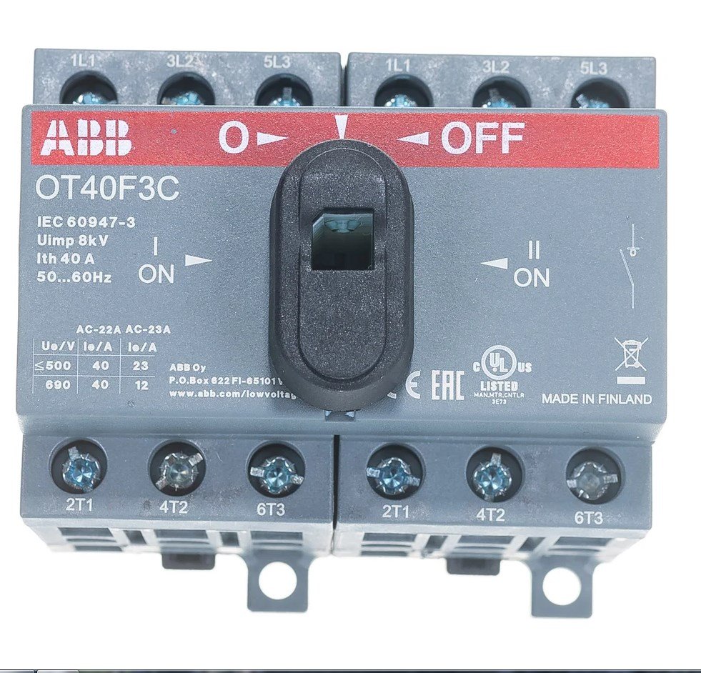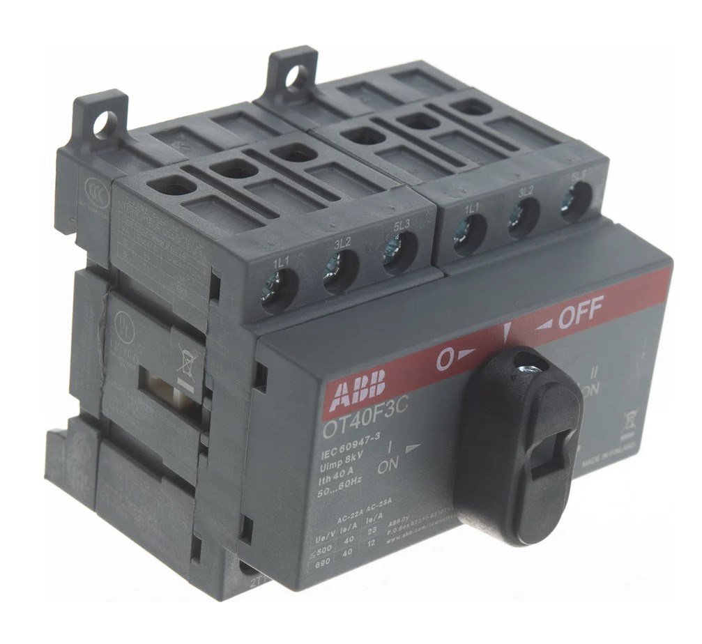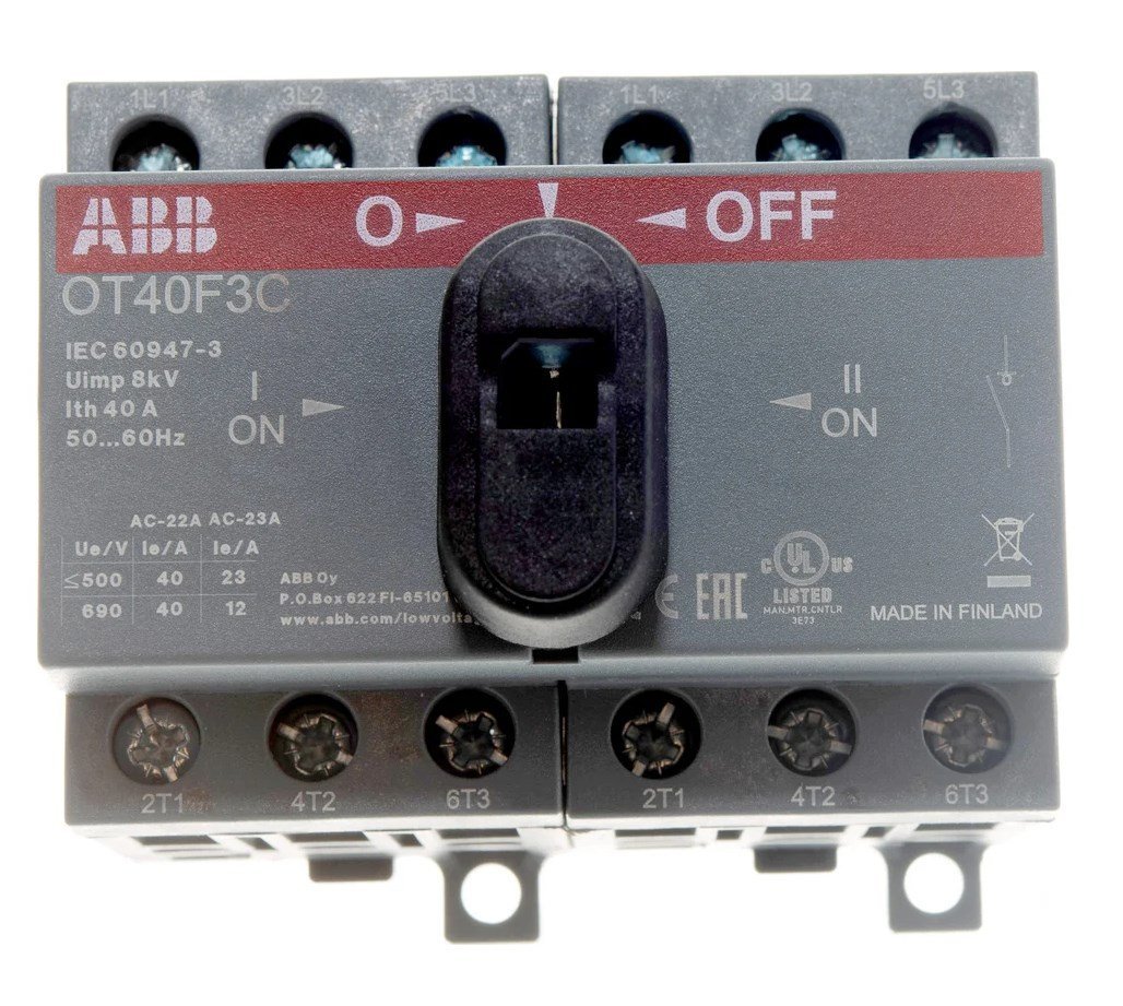 Рубильник 3п 40А ОТ40F3C реверсивный на DIN-рейку или монтажную плату с резервной ручкой ABB 1SCA104913R1001 используется в различных целях, начиная от центров дистанционного управления до распределительных щитов и рубильников на станочном оборудовании.