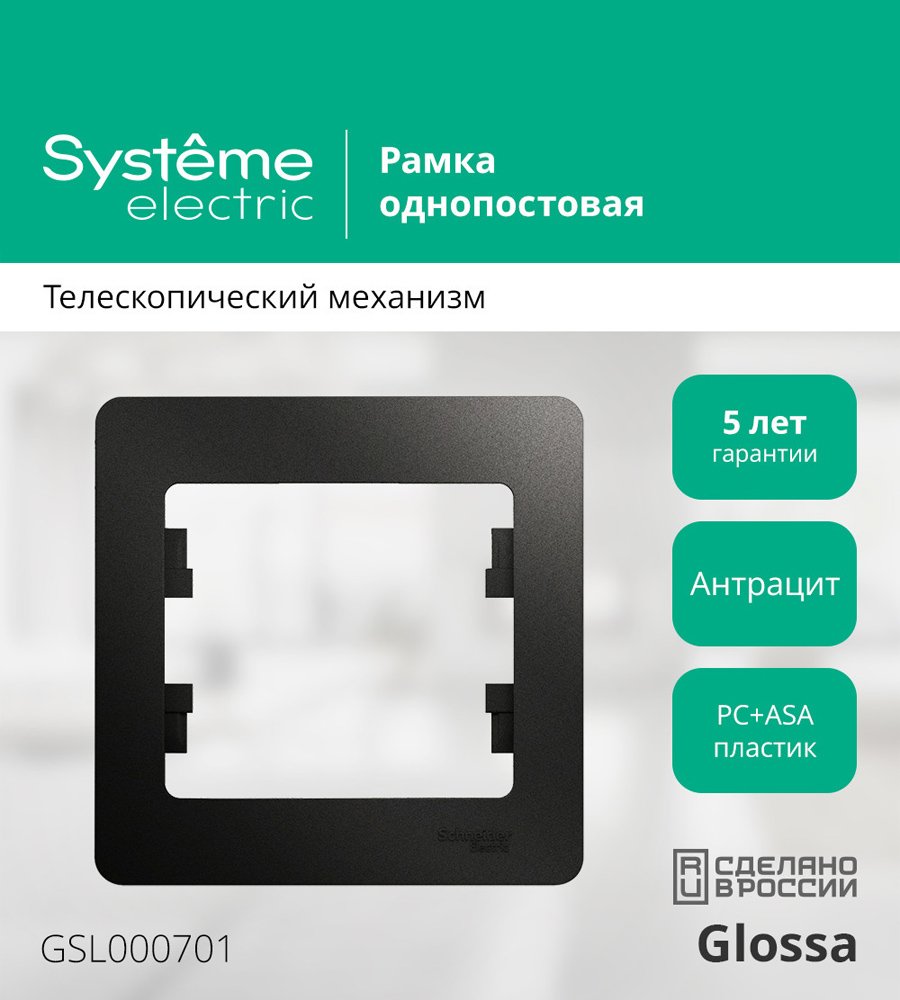 Рамка Systeme Electric (ранее Schneider Electric) серии Glossa (цвет антрацит) одинарная. Выполнена из материала PС+ASA, стойкого к УФ-излучению и появлению царапин. Позволяет гармонично вписать электроустановочное изделие в интерьер помещения.