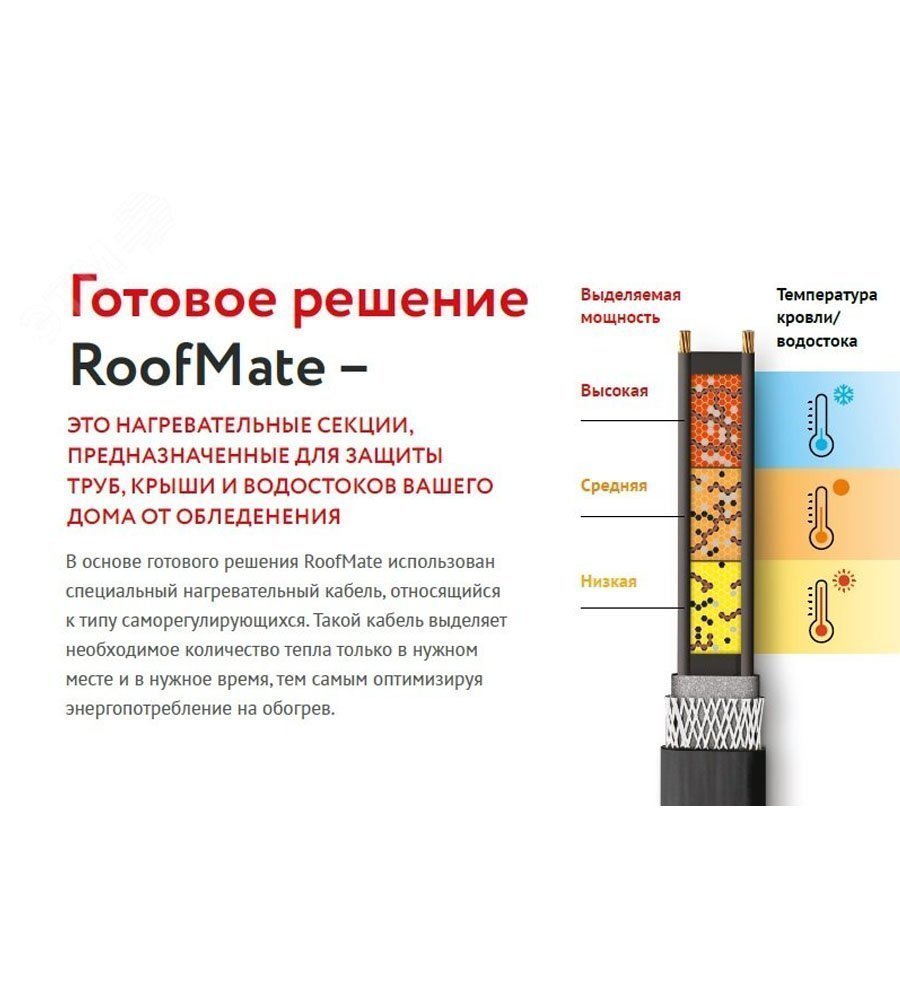 Секция нагревательная кабельная RoofMate 30Вт/м 5м саморегулируемая предназначена для предотвращения образования ледяных отложений на крышах зданий и водостоках.