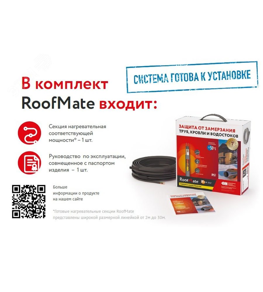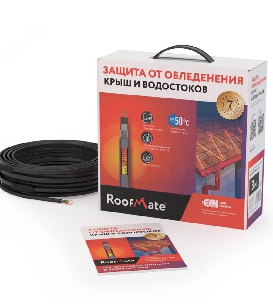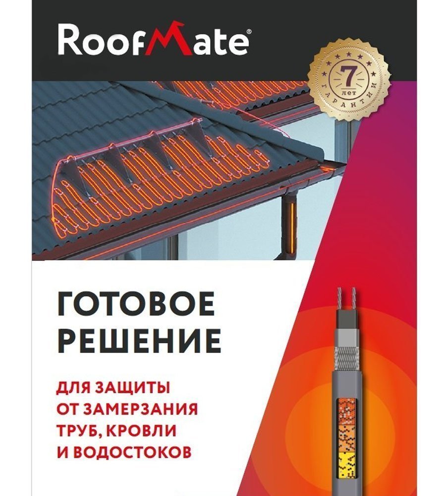 Секция нагревательная кабельная RoofMate 30Вт/м 6м саморегулируемая предназначена для предотвращения образования ледяных отложений на крышах зданий и водостоках.
