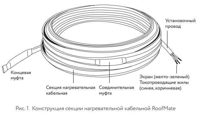 Нагревательная секция состоит из саморегулирующегося нагревательного кабеля, оснащенного с одной стороны соединительной муфтой и установочным проводом, а с другой стороны – концевой муфтой (см. рис. 1).