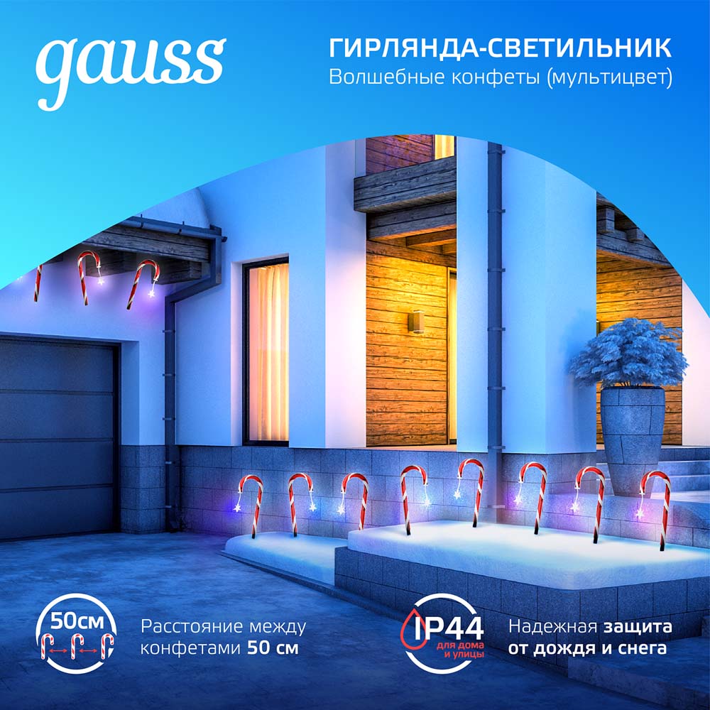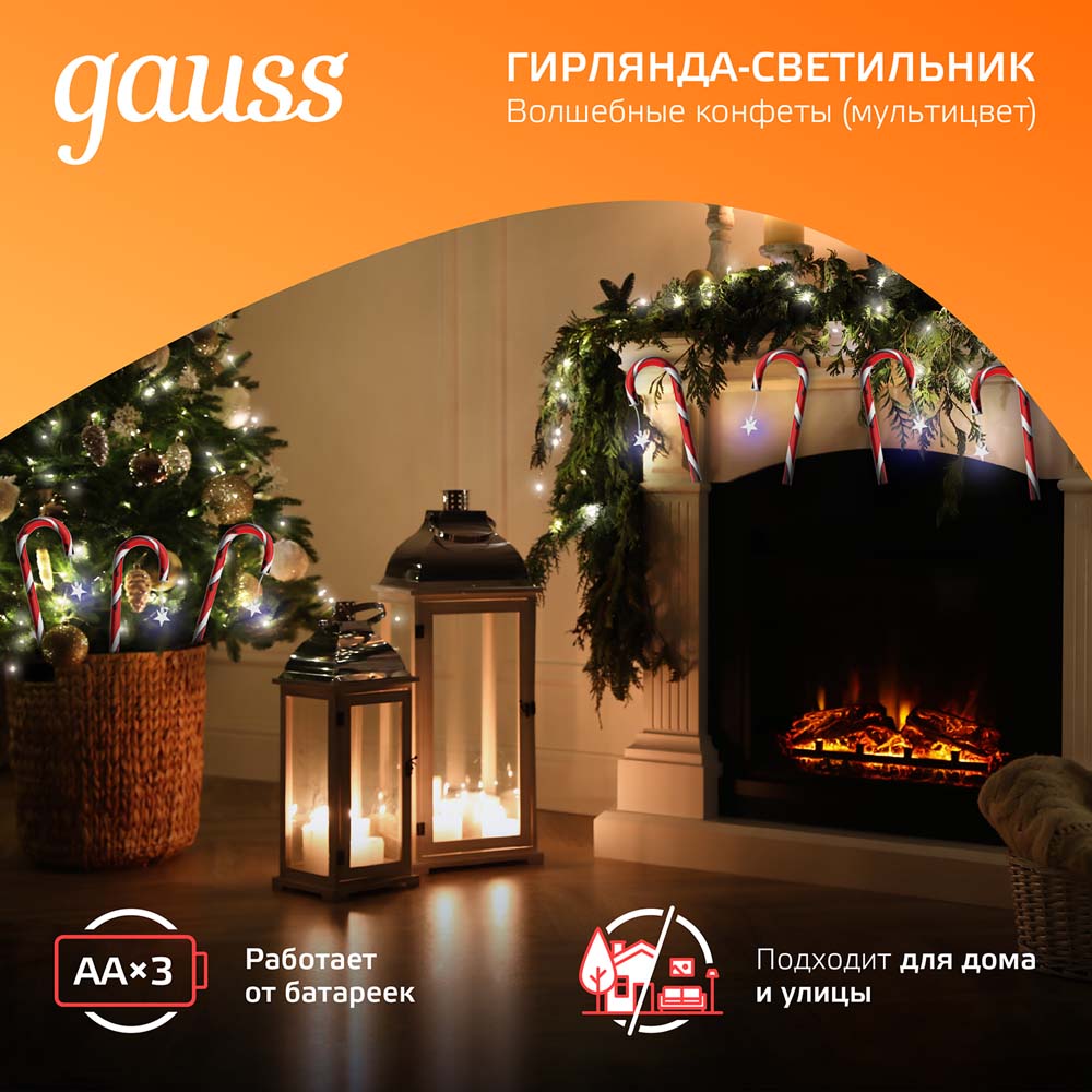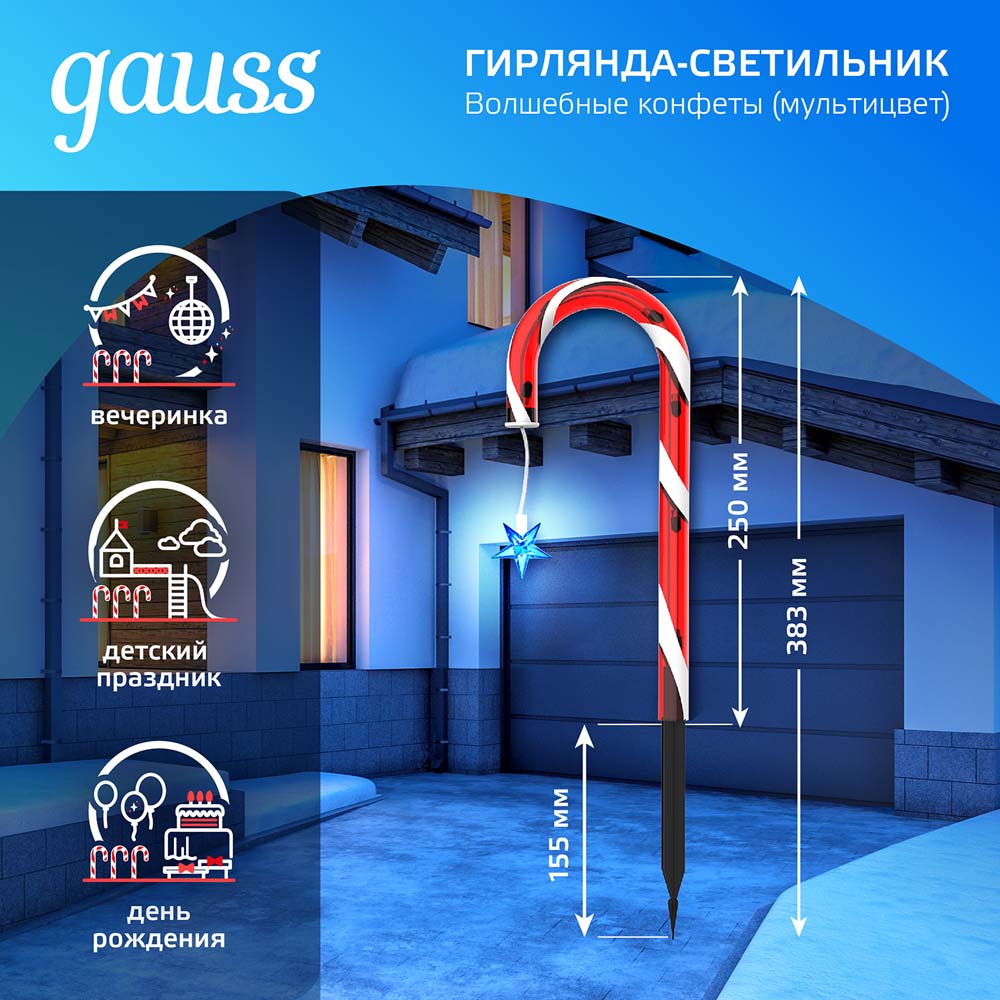 Светильник-гирлянда новогодняя Gauss Holiday " Волшебные конфеты" подарит ощущение праздника как взрослым, так и детям. В одном наборе доступно 8 светильников-конфет. Новогодняя гирлянда в виде леденцов изящная, стильная и нарядная. На конце каждого леденца имеется волшебная светящаяся звезда! В считанные минуты преобразит ваш интерьер и сделает его праздничным. Просто закрепите гирлянду на стене, шторах или ёлке, или разместите на балконе, перед домом или на крыльце. 8 различных режимов свечения для создания сказочного настроения каждый день. Подходит для декора фотозон! Можно использовать в помещениях и на улице. Для установки в снег или в грунт в комплекте есть специальные колышки. Создай волшебный праздник вместе с Gauss.