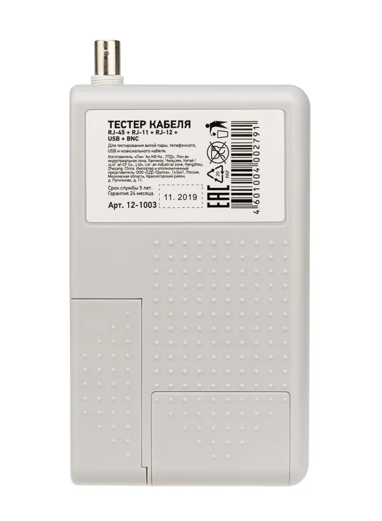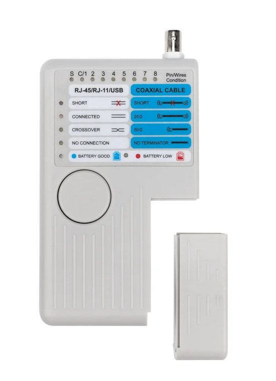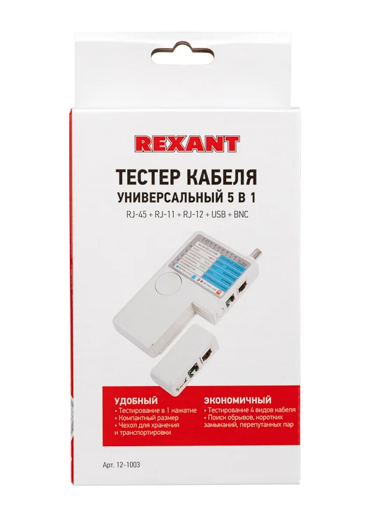 Тестер кабельный 5 в 1 RJ-45+RJ-11/RJ-12+1394+USB+BNC 3468 REXANT применяется для тестирования витой пары, телефонного, USB и коаксиального кабеля.