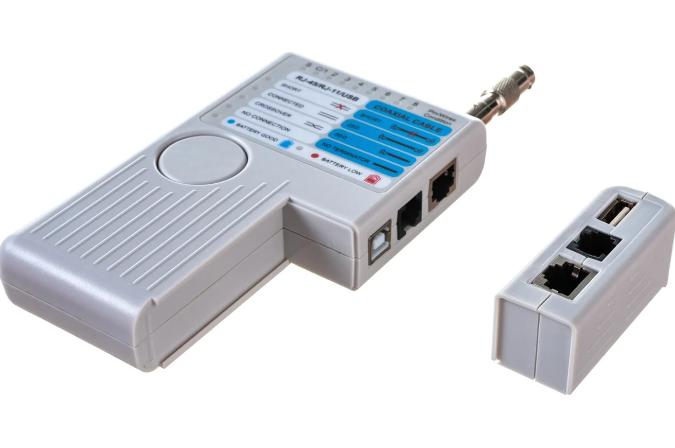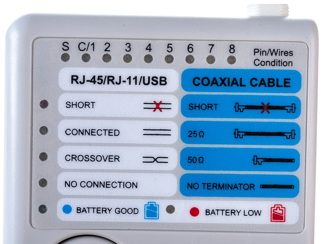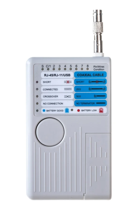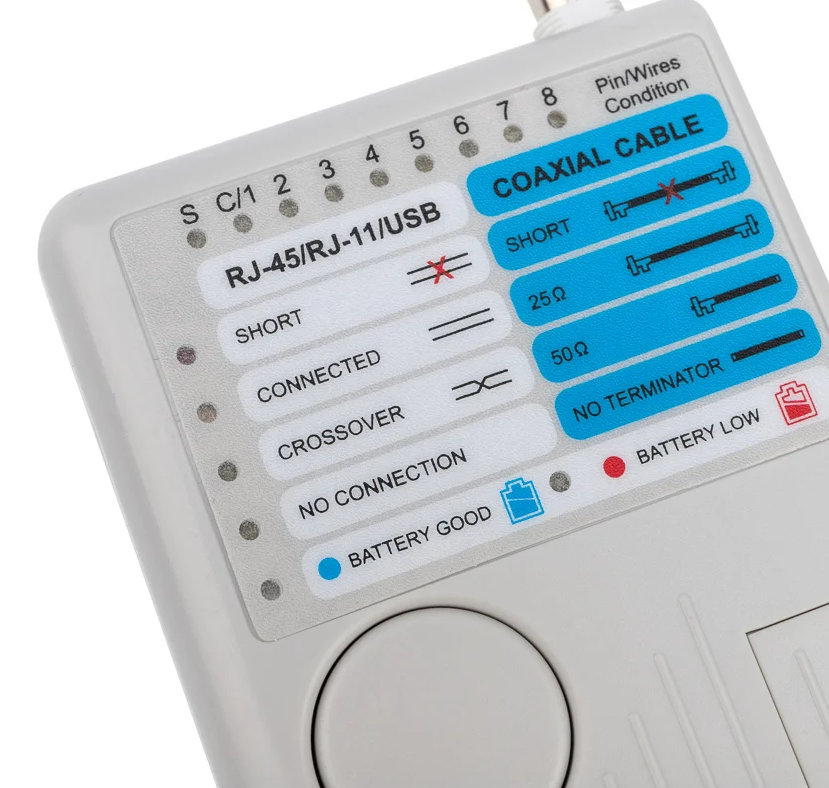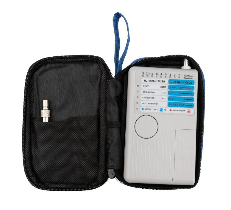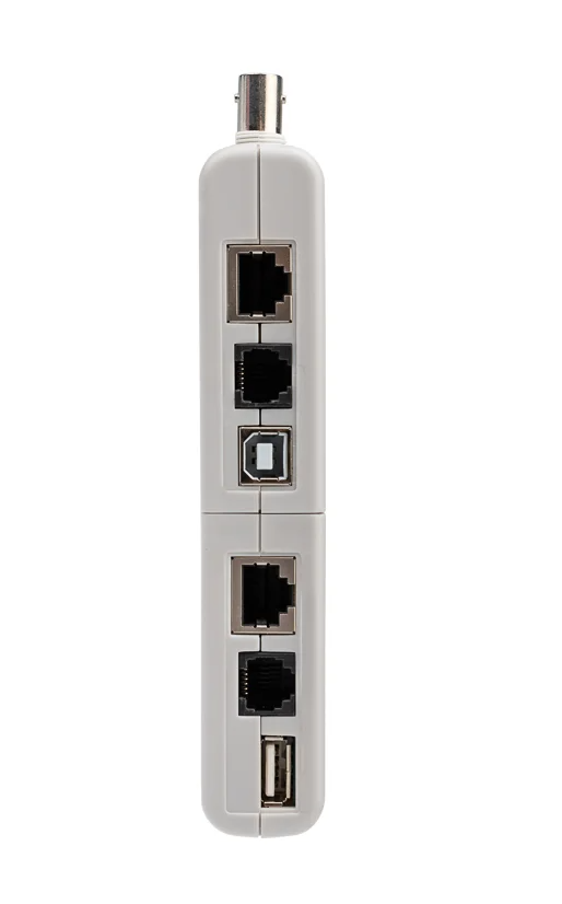 Тестер кабельных линий 5 в 1 позволяет тестировать 4 стандартных кабелей локальной сети (LAN) и компьютерных кабелей. Устройство тестирует установленные или коммутационные кабели с соединителями RJ-45, RJ-11, USB и BNC. Он предназначен для тестирования кабеля с переходным соединением, а не с обратным или транспонированным подключением, как в случае с некоторыми видами перекрестных кабелей локальных сетей (LAN) или обратных проводных телефонных кабелей.