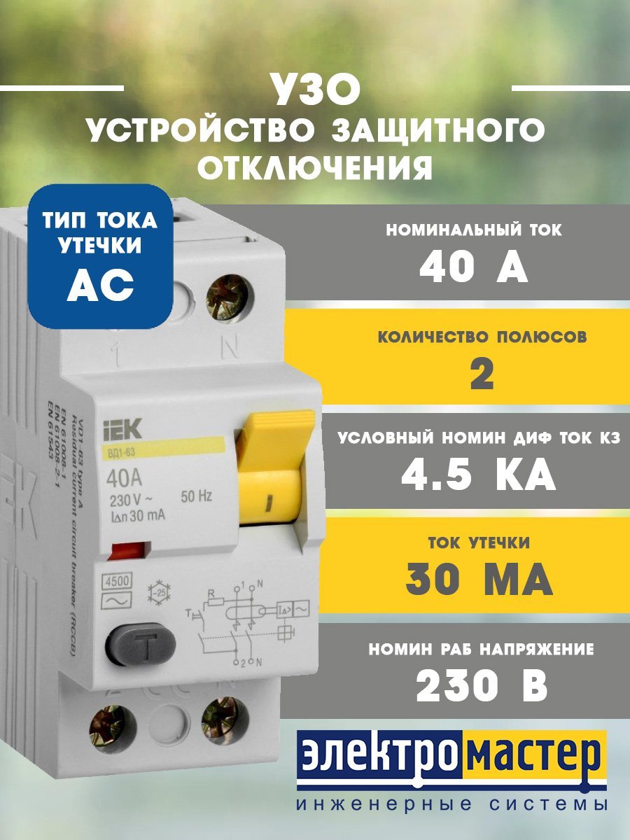 Устройство защитного отключения 2п 40А 30мА тип AC ВД1-63 KARAT ИЭК (MDV10-2-040-030)