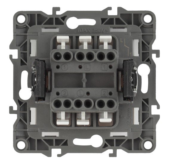 Выключатель серии Эра 12 скрытой установки изготовлен из поликарбоната, оснащён автоматическими клеммами для быстрой и надёжной фиксации жил кабеля в механизме. Парные клеммы обеспечивают соединение шлейфом. Монтаж в подрозетник производится и на лапки, и на винты. Рамки приобретаются отдельно
