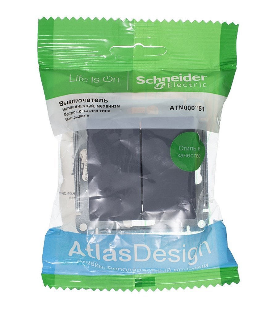 Механизм выключателя 2-клавишного Systeme Electric (ранее Schneider Electric) серии AtlasDesign в цвете грифель подходит для сетей 250 В, на ток 10 А. Двухклавишный выключатель позволяет управлять двумя источниками света с одной точки. Лицевые детали из качественного ABS-пластика, устойчивого к царапинам и УФ-излучению. Усиленные прямые монтажные лапки для лучшей фиксации механизма в монтажной коробке.