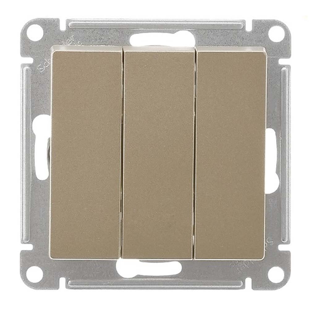 Механизм Systeme Electric (ранее Schneider Electric) серии AtlasDesign в цвете шампань выключателя 3-клавишного подходит для сетей 250 В, на ток 10 А. Трёхклавишный выключатель позволяет управлять тремя источниками света из одной точки.